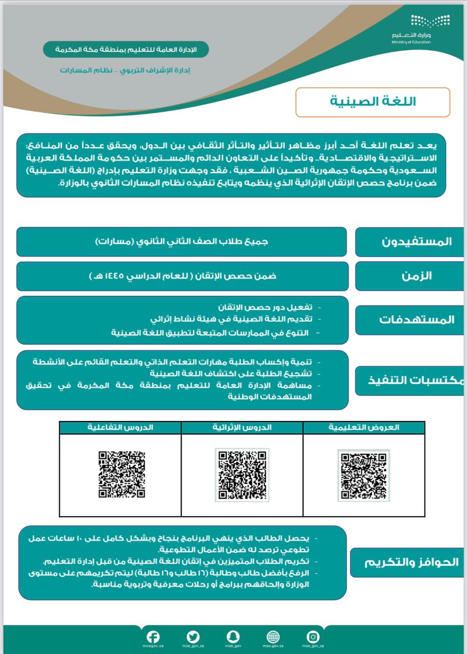 بدأ 28903 طالب وطالبة يتعلمون في 257 مدرسة ثانوية بالإدارة العامة للتعليم بمنطقة مكة المكرمة اللغة الصينية للعام الدراسي الحالي 1445هـ ؛ في نظام المسارات بالمدارس الحكومية والخاصة ، وذلك ضمن حصص الإتقان بواقع حصتين أسبوعياً لكل فصل دراسي في الصف الثاني الثانوي (12 – 24) حصة دراسية خلال الفصل ؛ على هيئة نشاط إثرائي متنوع الممارسات المتبعة لتطبيق اللغة الصينية وتزويد المدارس بالعروض التعليمية والدروس الإثرائية والتفاعلية ، وإسناد حصة الإتقان الإثرائية لمعلم ميسر في المدرسة ويقتصر دور المعلم في الحصة على دعم وتوجيه الطلبة نحو التعلم الذاتي خلال حصة الإتقان في حال ليس لديه مهارات اللغة الصينية ، والاستثمار الأمثل للكوادر البشرية المتاحة في المدرسة وتكليفهم بالإشراف على البرامج الإثرائية خلال العام الدراسي والتنويع في الممارسات المتبعة لتطبيق اللغة الصينية في مدارس التعليم العام الحكومية والأهلية ، حيث سيكون هناك محتوى وأنشطة إثرائية جاهزة تقدم للطلبة في حصة الإتقان ، تعزز تعّلم الطلبة واكتسابهم للغة الصينية كلغة مهمة ومؤثرة على المستوى الاقتصادي والثقافي في العالم ، وتنمية مهاراتهم واكسابهم مهارات التعلم الذاتي والتعلّم القائم على الأنشطة وتشجيعهم في وقت مبكر على استكشاف اللغة الصينية ومن ثم الإقدام على تسجيل مادة اللغة الصينية في الصف الثالث الثانوي في المجال الاختياري.