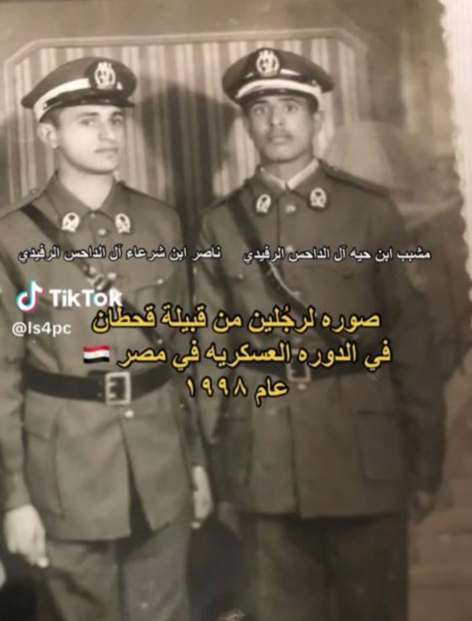 عثر على صورة تعود لعام ١٣٩٨ للهجرة وهي للأستاذ مشبب بن حسين آل محي والأستاذ ناصر بن محمد آل شرعا من قرى محافظة أحد رفيدة بمنطقة عسير وكانت الصورة أثناء ترشيحهما عام ١٣٩٨ للهجرة لدورة عسكرية بجمهورية مصر العربية حيث كانت تعقد الدورات العسكرية في جمهورية مصر العربية في “معهد أمناء الشرطة بالقاهرة” وكانت اخر دورة عقدت هناك عام ١٣٩٩ للهجرة ثم في عام ١٤٠٠ للهجرة تم إفتتاح “مدينة التدريب بالأمن العام ” بالعاصمة الرياض وأصبحت الدورات تعقد فيه داخلية وخارجية وبفضل الله تعالى تطورت القطاعات العسكرية في المملكة العربية السعودية في جميع كافة القطاعات العسكرية وأصبحت مميزة على مستوى العالم نسأل الله تعالى للأستاذ مشبب ال محي والأستاذ ناصر آل شرعا حياة سعيدة عامرة بالطاعة .