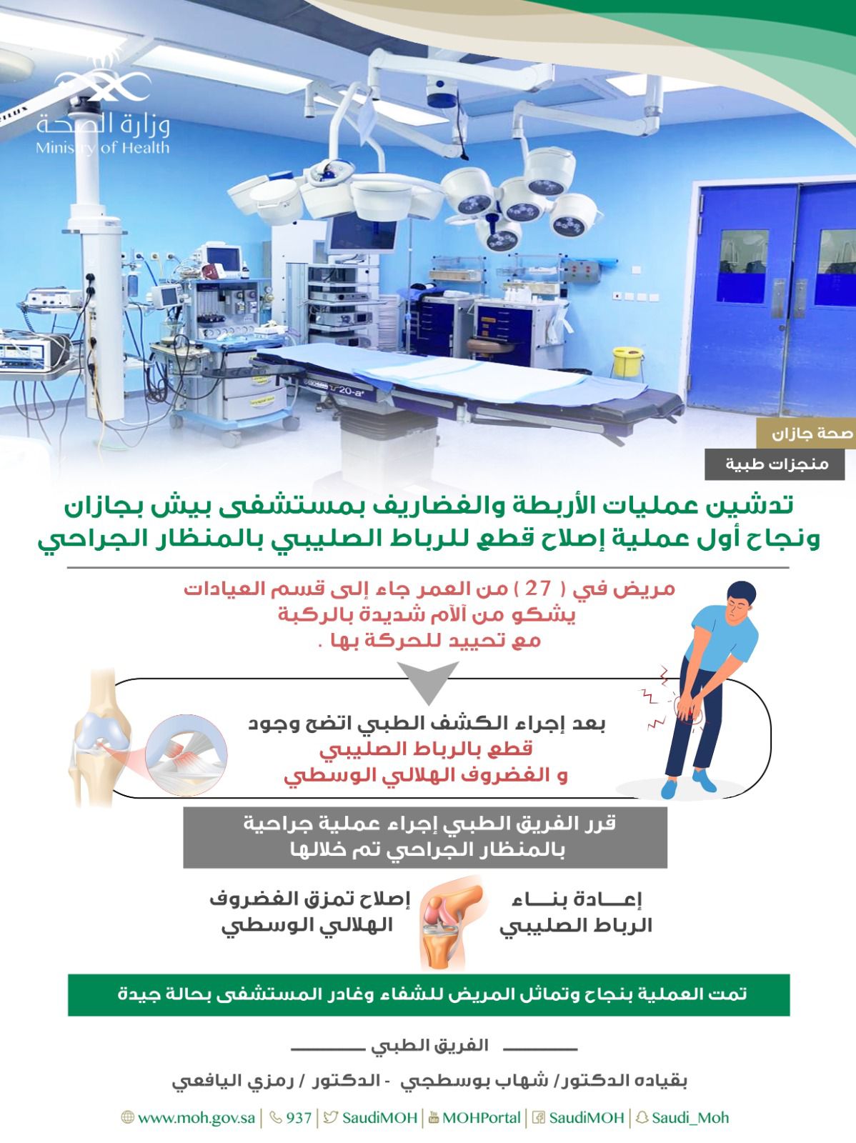 قالت صحة جازان بأنه تم تدشين عمليات الأربطة والغضاريف بمستشفى بيش وإجراء أول عملية إصلاح قطع للرباط الصليبي بالمنظار الجراحي بالمستشفى.