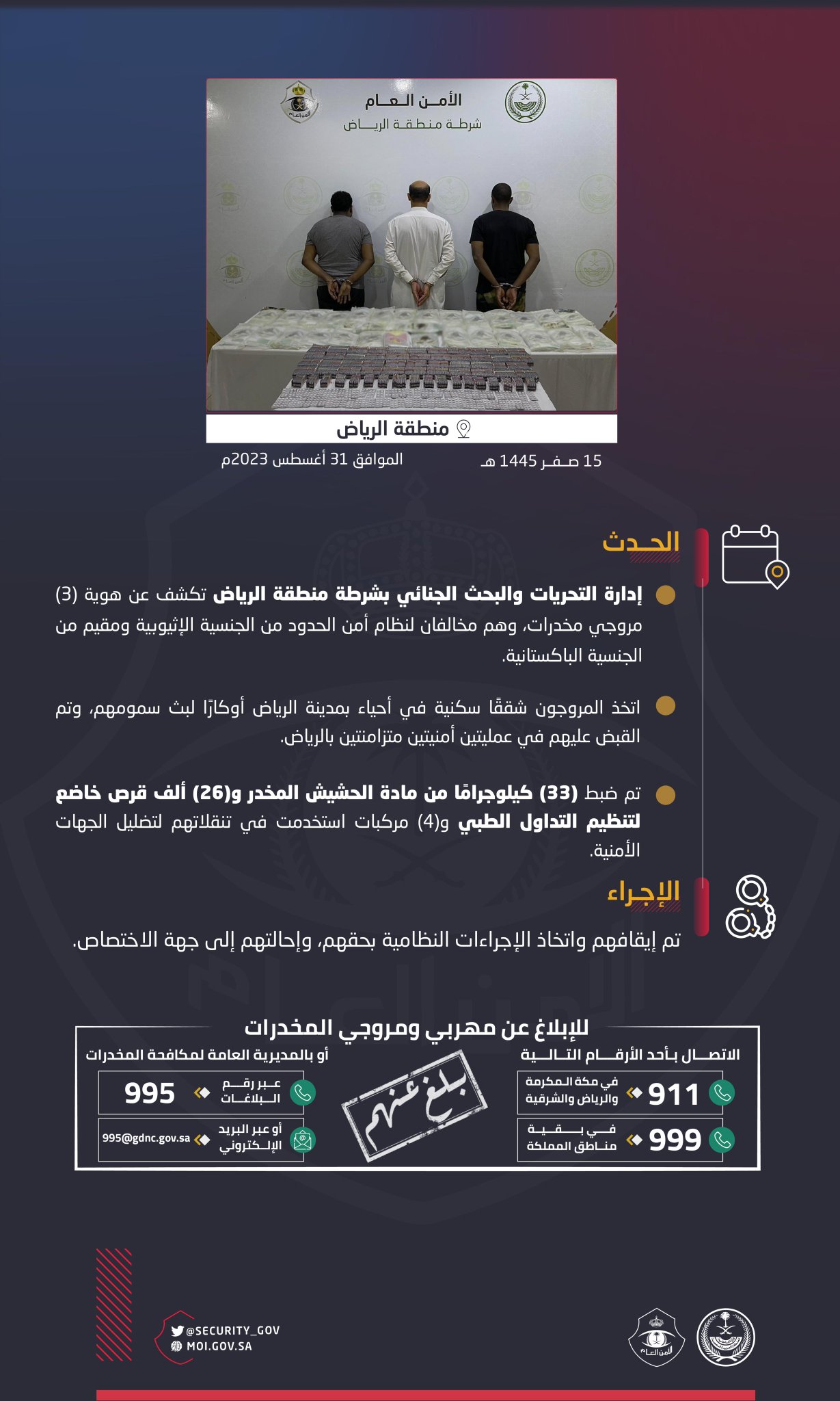 عبر موقع الأمن العام على الشبكة العنكبوتية اكس تويتر سابقا @security_gov خبر بأن إدارة التحريات والبحث الجنائي بشرطة منطقة الرياض تمكن رجالها بتوفيق من الله ثم بما يتمتعون به من يقضة من أحباط ترويج (33) كيلوجرامًا من مادة الحشيش المخدر و(26) ألف قرص خاضع لتنظيم التداول الطبي. وارفق بذلك منشور يوضح انه تم إيقافهم واتخاذ الإجراءات النظمية بحقهم واحالتهم لجهات الاختصاص.