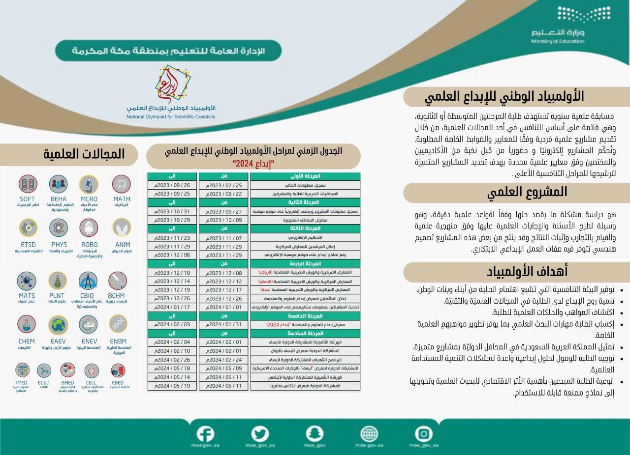 تعليم مكة يدعو طلاب وطالبات المرحلتين المتوسطة والثانوية للتسجيل في أولمبياد “إبداع 2024