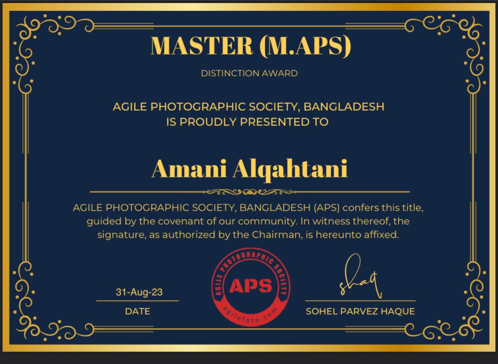 نالت المصورة السعودية أماني القحطاني على لقب الماستر (M.APS) من قبل جمعية أجيل للتصوير في بنغلاديش، ويعتبر هذ اللقب الثالث التي نالته اماني بنفس الجمعية، التي تشترط قبول ١٠٠ عمل في مسابقات الجمعية، ويتم تكريم الإنجازات الفردية للمصورين الهواة أو المحترفين في جميع أنحاء العالم الذين يشاركون في مسابقات التصوير الفوتوغرافي تحت رعاية APS، وتصنيفهم سنويًا في قائمة الشرف الخاصة بـ APS، والتي سوف تنشر اسماء الحاصلين على الالقاب في الموقع الرسمي للجمعية.