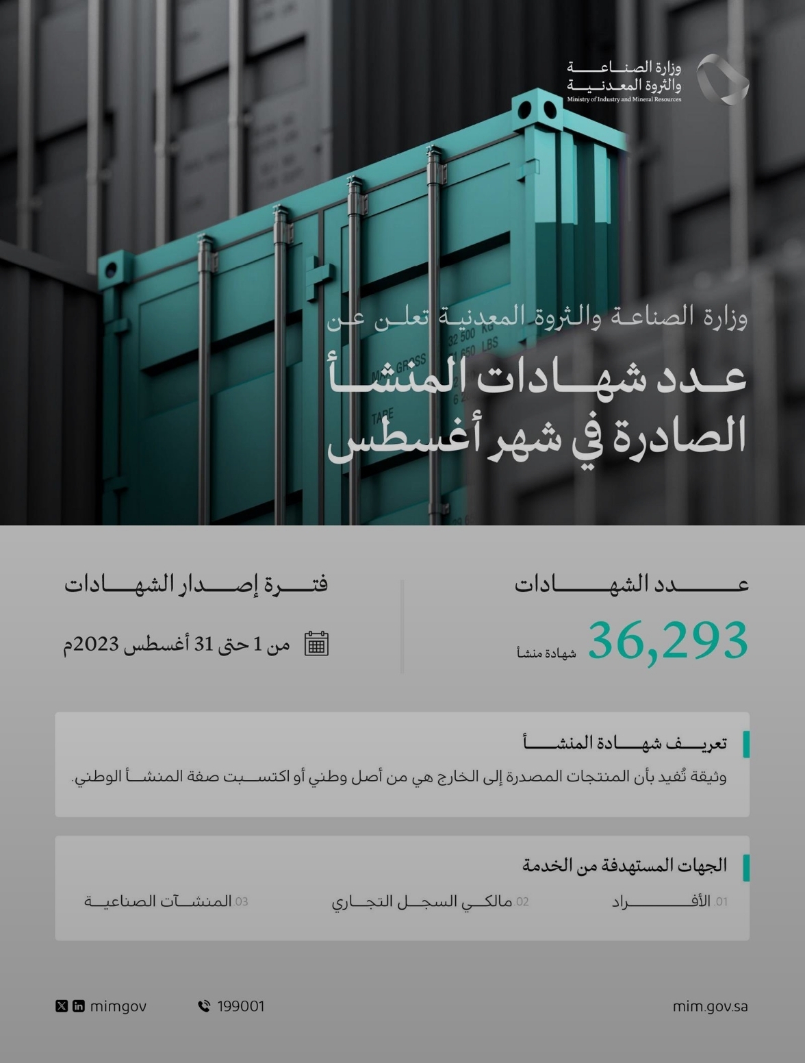 وأوضحت الوزارة أنه يمكن التقديم للحصول على شهادة المنشأ من الموقع الإلكتروني للوزارة من خلال الرابط: https://coo.mim.gov.sa/ .