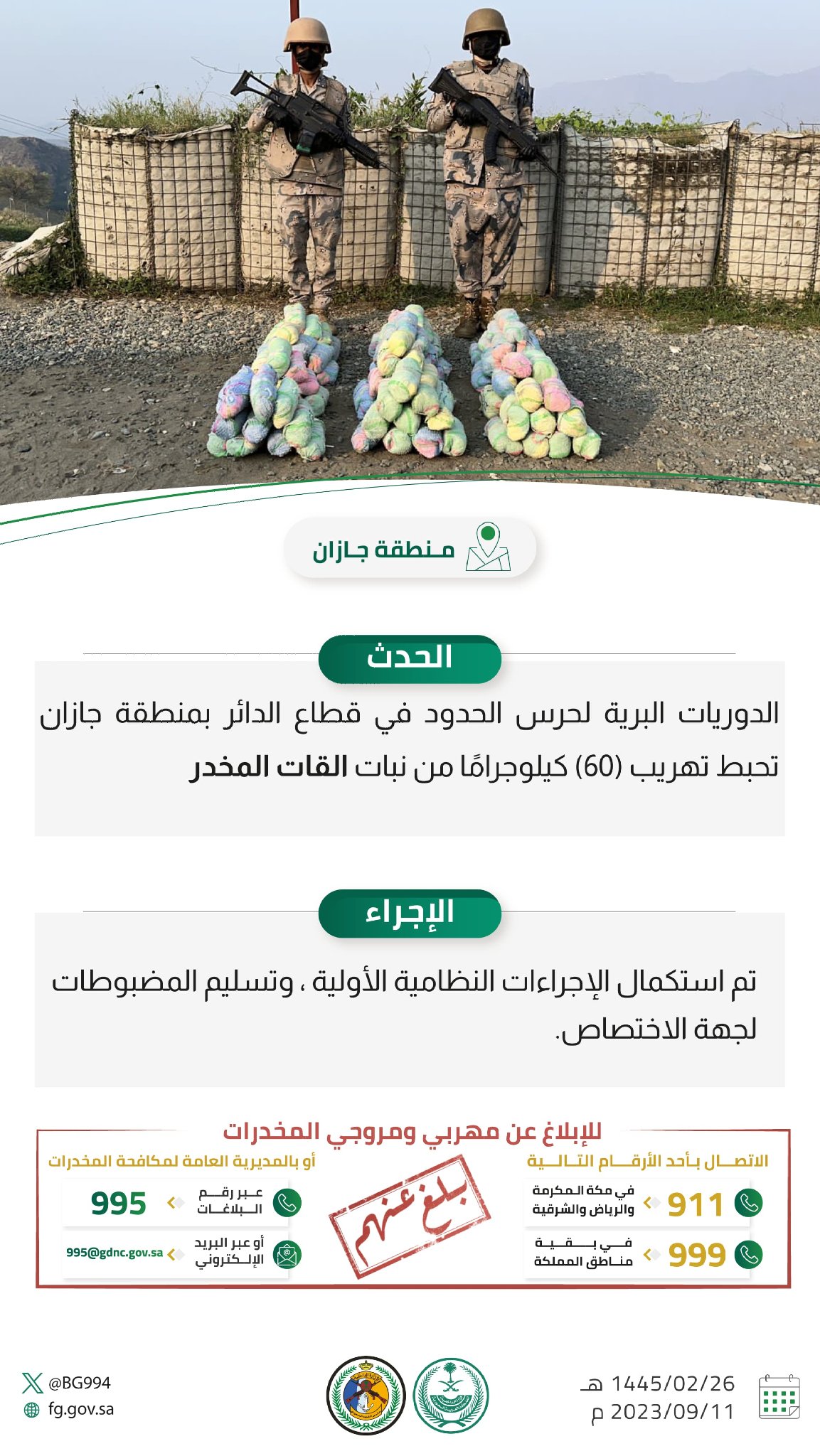 تمكن بفضل من الله وبيقضة رجال الدوريات البرية لحرس الحدود في قطاع الدائر بمنطقة جازان @BG994 من أحباط تهريب (60) كيلوجرامًا من نبات القات المخدر، وجرى استكمال الإجراءات النظامية الأولية، وتسليم المضبوطات لجهة الاختصاص.