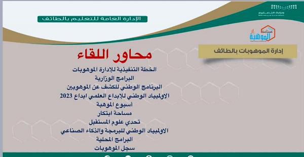 عقدت الإدارة العامة للتعليم بمحافظة الطائف ممثلةً في إدارة الموهوبات، اللقاء السنوي بمعلمات الموهوبات بمدراس محافظة الطائف بمراحلها المختلفة وذلك عبر برنامج (Webx).