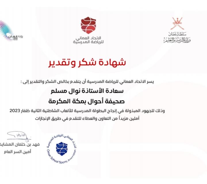 من صحيفة أحوال – وذلك نظير جهودها المبذولة في إنجاح البطولة المدرسية للألعاب الشاطئية الثانية التي أقيمت في مدينة ظفار عام 2023م