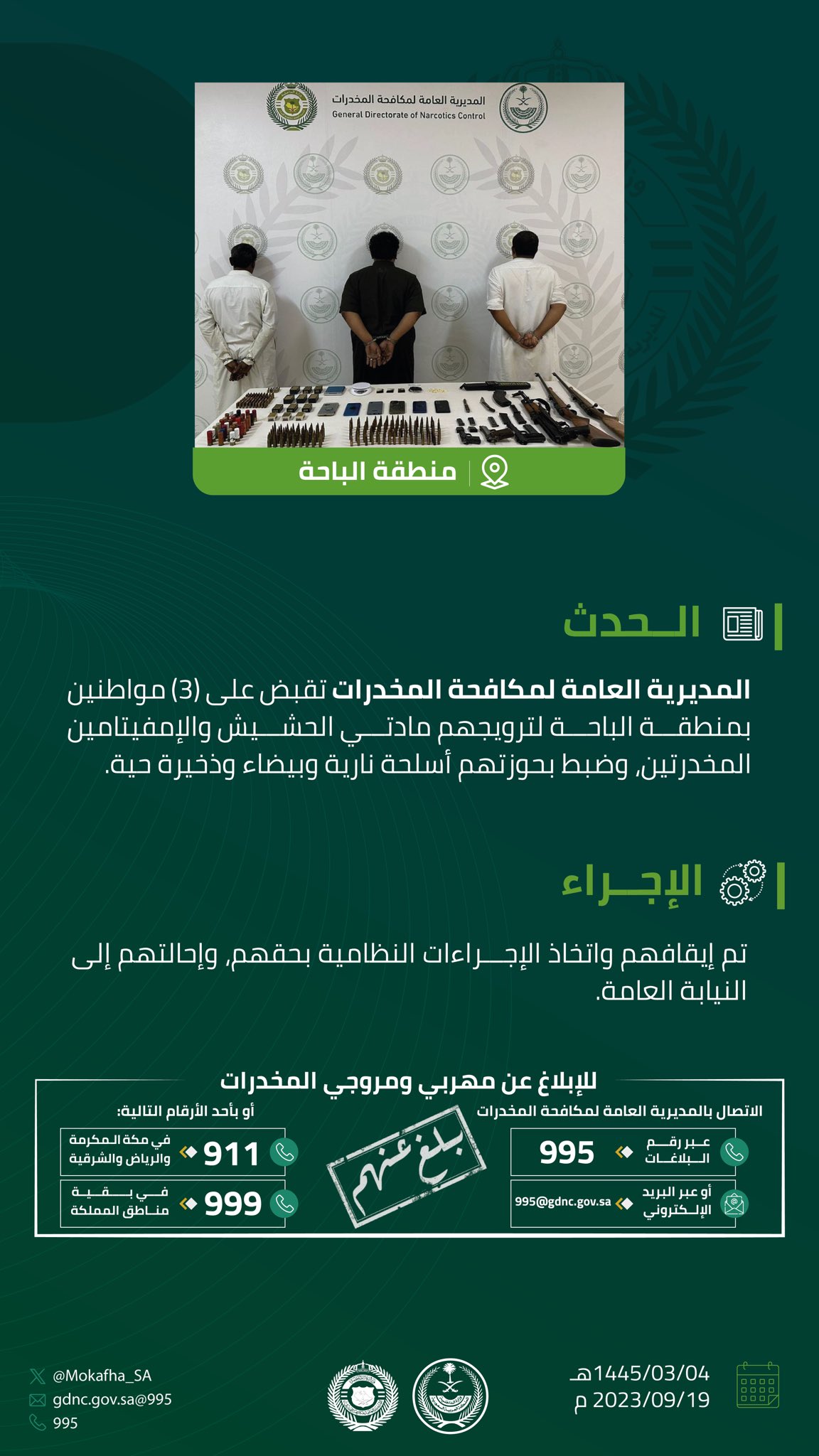 وتهيب الجهات الأمنية بالإبلاغ عن كل ما يتوافر من معلومات لدى المواطنين والمقيمين عن أي نشاطات ذات صلة بتهريب أو ترويج المخدرات، وذلك من خلال الاتصال بالأرقام (911) في مناطق مكة المكرمة والرياض والشرقية و(999) في بقية مناطق المملكة، ورقم بلاغات المديرية العامة لمكافحة المخدرات (995)، وعبر البريد الإلكتروني 995@gdnc.gov.sa، وستعالج جميع البلاغات بسرية تامة.
