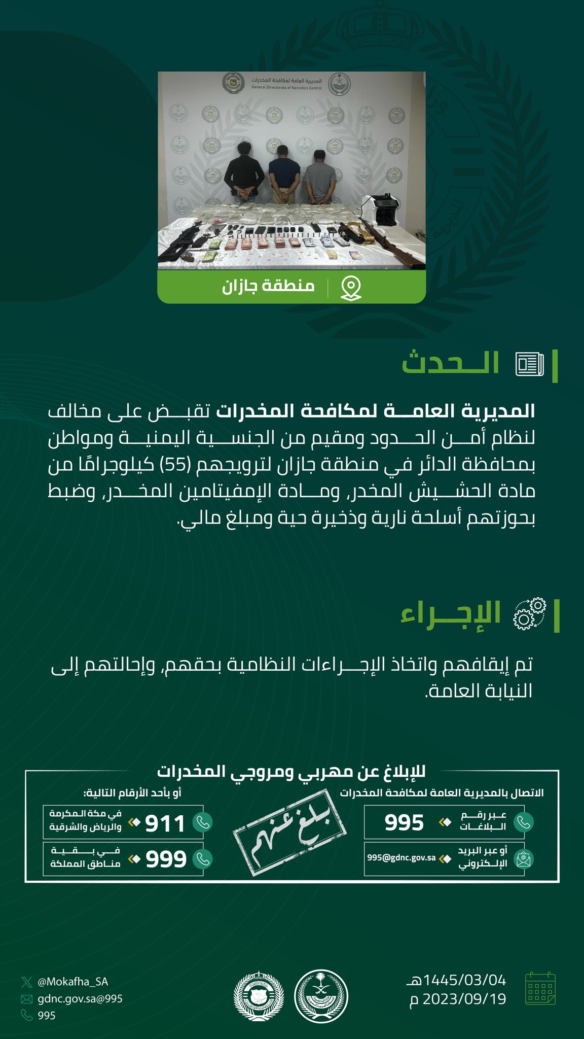 قبضت المديرية العامة لمكافحة المخدرات على مخالف لنظام أمن الحدود ومقيم من الجنسية اليمنية ومواطن بمحافظة الدائر في منطقة جازان لترويجهم (55) كيلوجرامًا من مادة الحشيش المخدر ومادة الإمفيتامين المخدر، وضبط بحوزتهم أسلحة نارية وذخيرة حية ومبلغ مالي، وجرى إيقافهم واتخاذ الإجراءات النظامية بحقهم، وإحالتهم إلى النيابة العامة.
