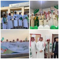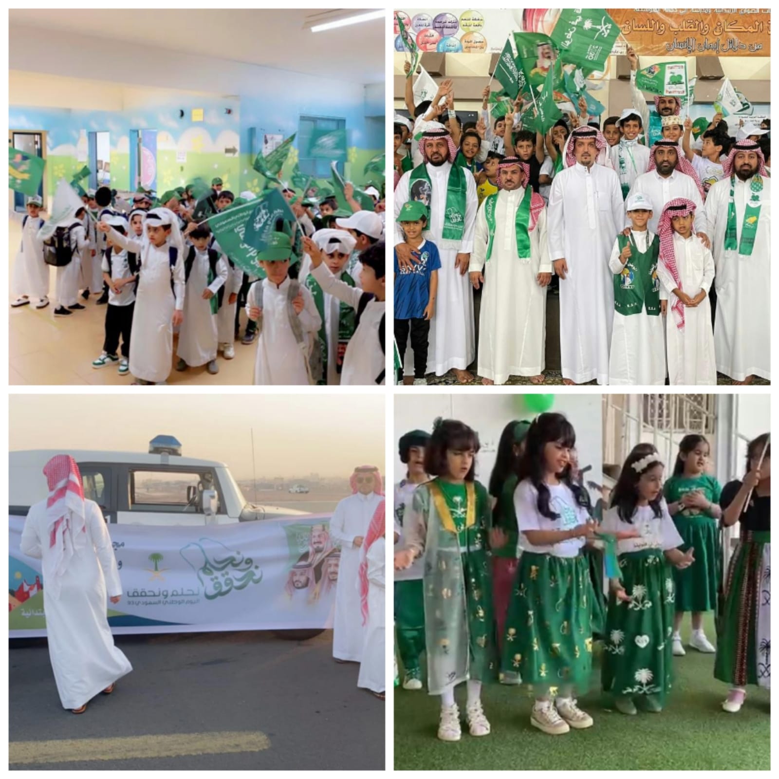 أما داخل البيئة المدرسية أمتزج الاحتفال بالفنون الشعبية ورافع العلم السعودي وتسجيل عبارات الحب والوفاء للوطن على الحائط الجداري رافقتها ابتسامة وفرحة وطن لجميع منسوبيها بمختلف المراحل التعليمية ، وكان من أميزها فعالية تحمل شعار اليوم الوطني لهذا العام “نحلم ونحقق” عبر فيها الطلاب والطالبات عن ميولهم الوظيفي في مجال الطب والعسكري والمهني لخدمة بلدهم الغالي.