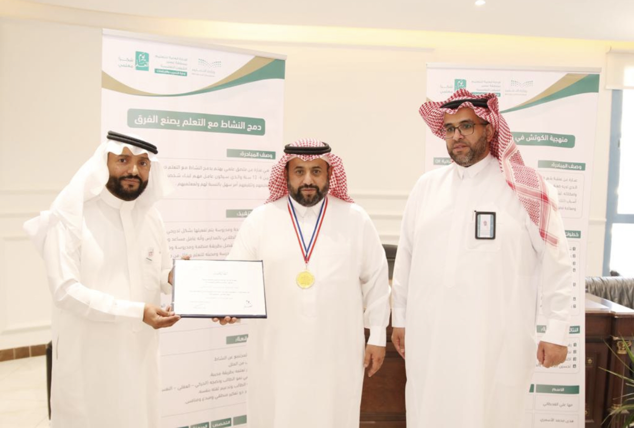 كرم سعادة وكيل وزارة التعليم للشؤون المدرسية الدكتور ناصر الشلعان الموجه الطلابي بمدرسة حكيم بن حزام بخميس مشيط عبدالرحمن بن عيسى آل مرعي يوم الخميس الموافق ٢٠ ربيع الأول لعام ١٤٤٥ للهجرة جاء هذا التكريم بمناسبة عرض مبادرة “دمج النشاط مع التعلم يصنع الفرق” من إعداد الموجه الطلابي بمدرسة حكيم بن حزام بخميس مشيط الأستاذ عبدالرحمن عيسى مرعي القحطاني