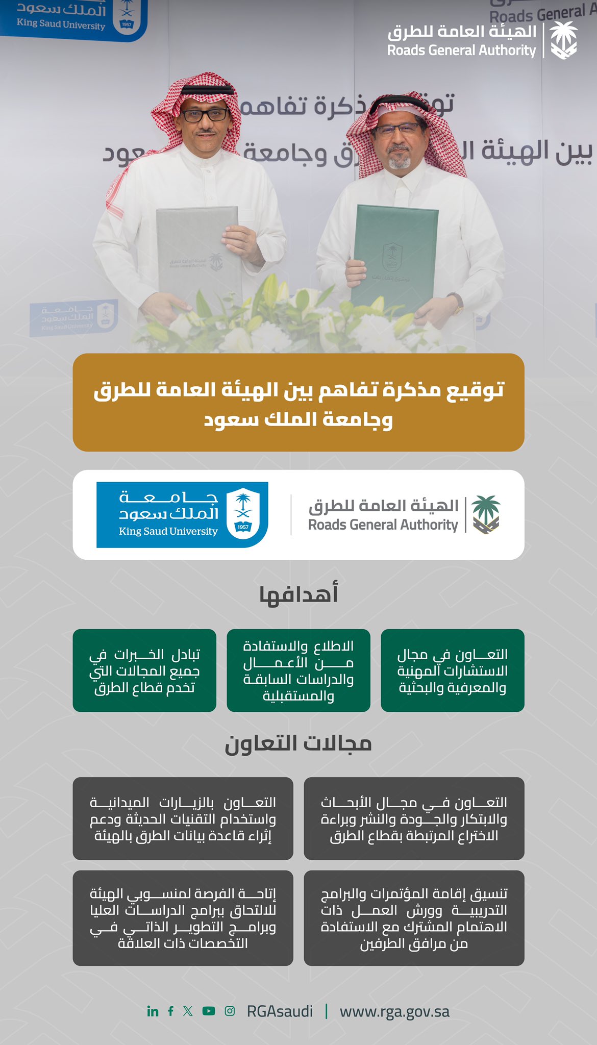 إذ وقّعت الهيئة العامة للطرق مع جامعة الملك سعود مذكرة تفاهم تهدف لتعزيز التعاون في مجال الاستشارات المهنية والمعرفية والبحثية، بالإضافة للاطلاع والاستفادة من الأعمال والدراسات السابقة والمستقبلية، مع تبادل الخبرات في جميع المجالات التي تخدم قطاع الطرق.
