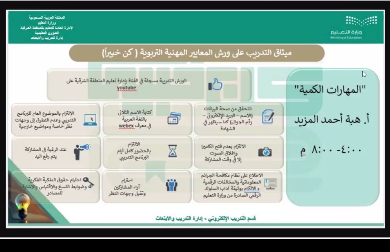 وفي هذا الصدد أشار المتحدث الرسمي لتعليم الشرقية سعيد الباحص، إلى 9 مجالات رئيسية ترتكز عليها تلك البرامج بدءاً من “النهوض بالقيم والمسؤولية المهنية والمهارات الكمية واللغوية ونظريات التعلم وخصائص النمو والفروق الفردية بين المتعلمين ومداخل وطرق التدريس العامة بالإضافة إلى التخطيط للتدريس وتنفيذه والبيئة التفاعلية والداعمة للتعلم والتقويم التربوي “، وتابع كما أتاحت إدارة تعليم المنطقة الوصول لتلك البرامج التي تقدم لمنسوبيها عن بعد عبر الـ Weppbex أيضاً تسجيلها عبر قناتها على اليوتيوب لتمكين كافة المعلمين والمعلمات من الدخول والوقوف على مضامين ومحتوى تلك البرامج التي تستمر على مدى 3 أسابيع.
