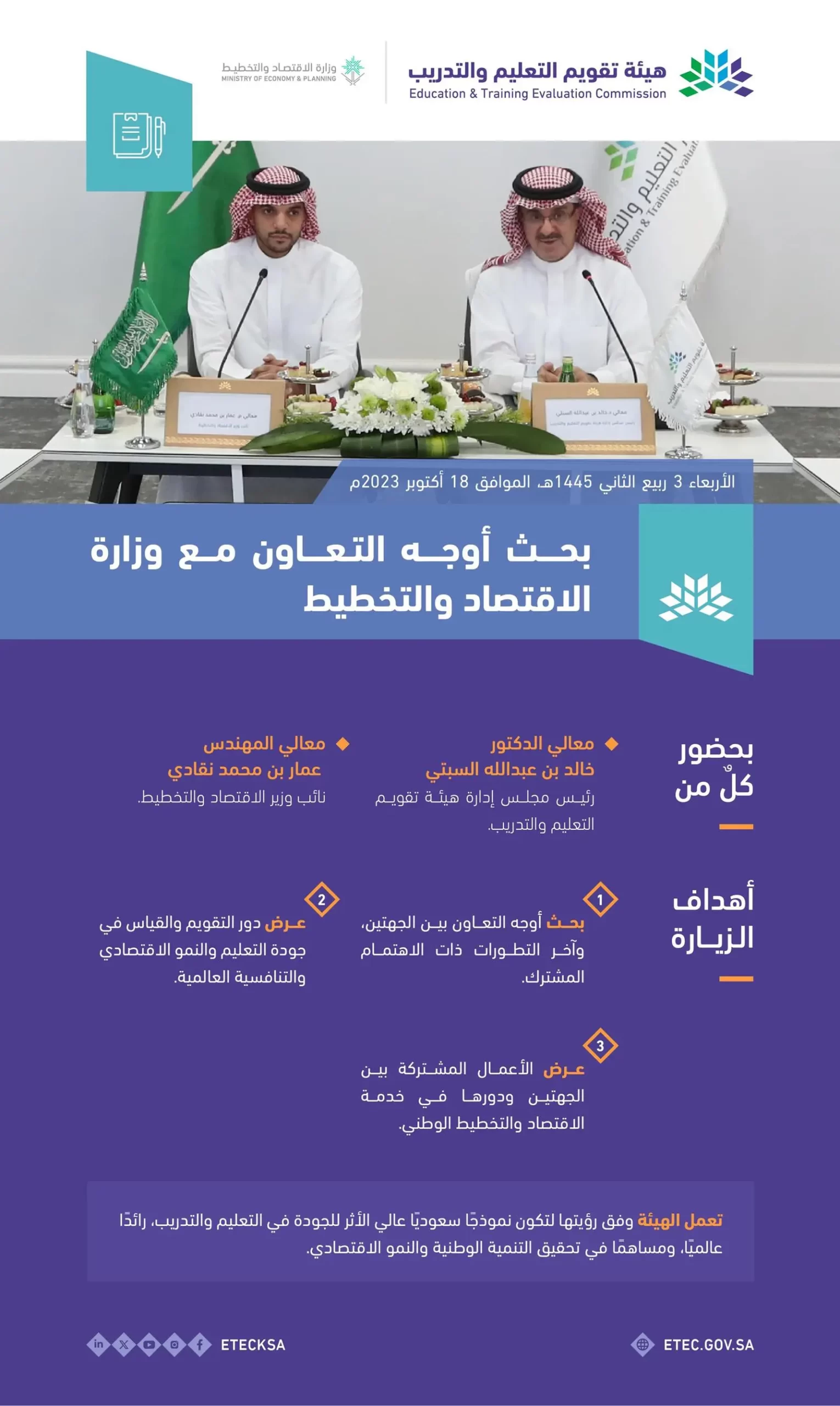 عقدت هيئة تقويم التعليم والتدريب، اليوم اجتماعاً مع وزارة الاقتصاد والتخطيط لبحث أوجه التعاون، بحضور معالي رئيس مجلس إدارة الهيئة الدكتور خالد بن عبدالله السبتي، ومعالي نائب وزير الاقتصاد والتخطيط المهندس عمار بن محمد نقادي, والوفد المرافق له, وذلك بمقر الهيئة بالرياض.