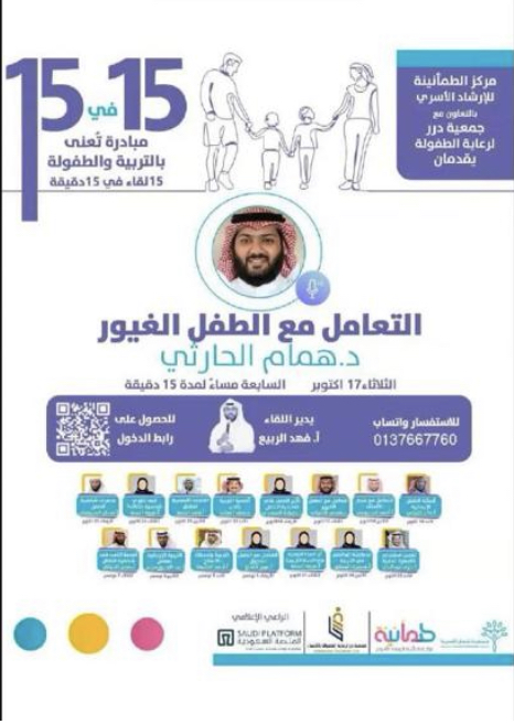 وانطلقت المبادرة الأولى من نوعها عبر مركز طمأنينة البرنامج التربوي بالتعاون مع جمعية درر لرعاية الطفولة، وشراكة إعلامية للمنصة السعودية، في الخامس عشر من شهر اكتوبر الجاري، وتستمر حتى السابع من نوفمبر، وتركز على لقاءات سريعة لا يتجاوز اللقاء الواحد 15 دقيقة، يقدم خلاصة الخبرات في التربية الصحيحة القائمة على احترام شخصية الطفل، والتربية بالثواب والعقاب ووضع الحدود وتقديم الخيارات المتعددة، واسلوب الثناء والمدح والابتعاد عن العقاب.