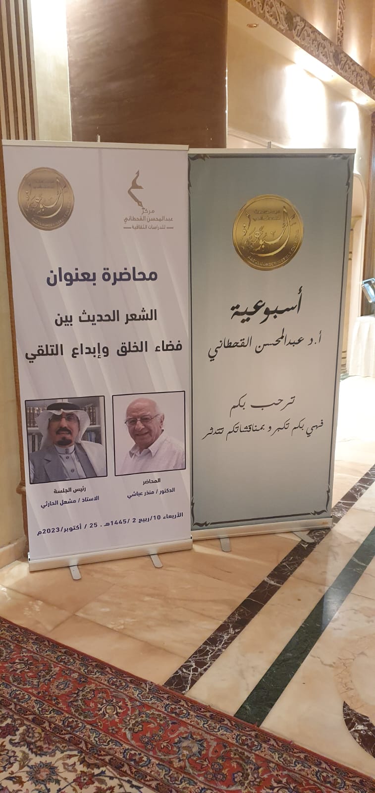 أعلن مستشارامير منطقة مكة المكرمة ونائب رئيس مجلس الشورى الأسبق معالي الدكتورعبد الله المعطاني تحيات وثناء سموالأمير خالد الفيصل على الأسبوعية وصاحبها الدكتور عبد المحسن القحطاني ودورها الفاعل في خدمة الأدب والثقافة، كما أعلن تقديم سموه هدية رمزية لضيف الأسبوعية الدكتور منذرعياشي تقديراً لدوره ايضاً في خدمة الأدب واللغة العربية ووفائه للمملكة العربية السعودية، جاء ذلك في الكلمة التي القاها معاليه في مستهل المحاضرة التي القاها ضيف الأسبوعية الدكتور منذر عياشي مساء البارحة الأربعاء ضمن نشاط الأسبوعية في موسمها لهذا العام 1445هـ وتحت عنوان (الشعرالحديث بين فضاء الخلق وإبداع التلقي) وأدارها المستشار الإعلامي الاسبق بجامعة جدة الأستاذ مشعل الحارثي وبحضورنخبة مميزة من الأدباء والمثقفين والإعلاميين ورواد الأسبوعية.