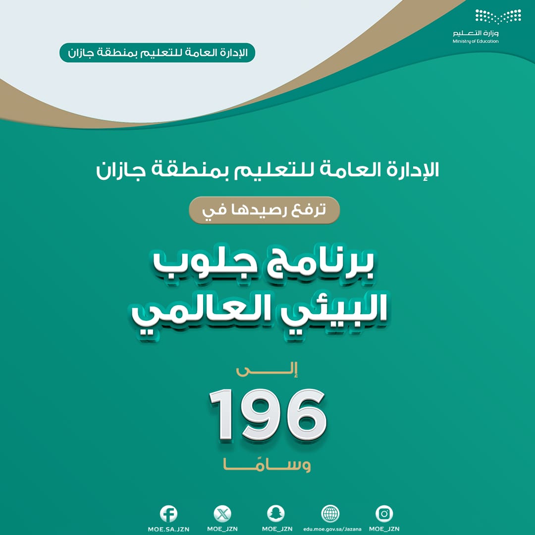 رفعت الإدارة العامة للتعليم بمنطقة جازان رصيدها في برنامج “جلوب” البيئي العالمي إلى 196 وسامًا، في عددٍ من المجالات البيئية والعلمية.