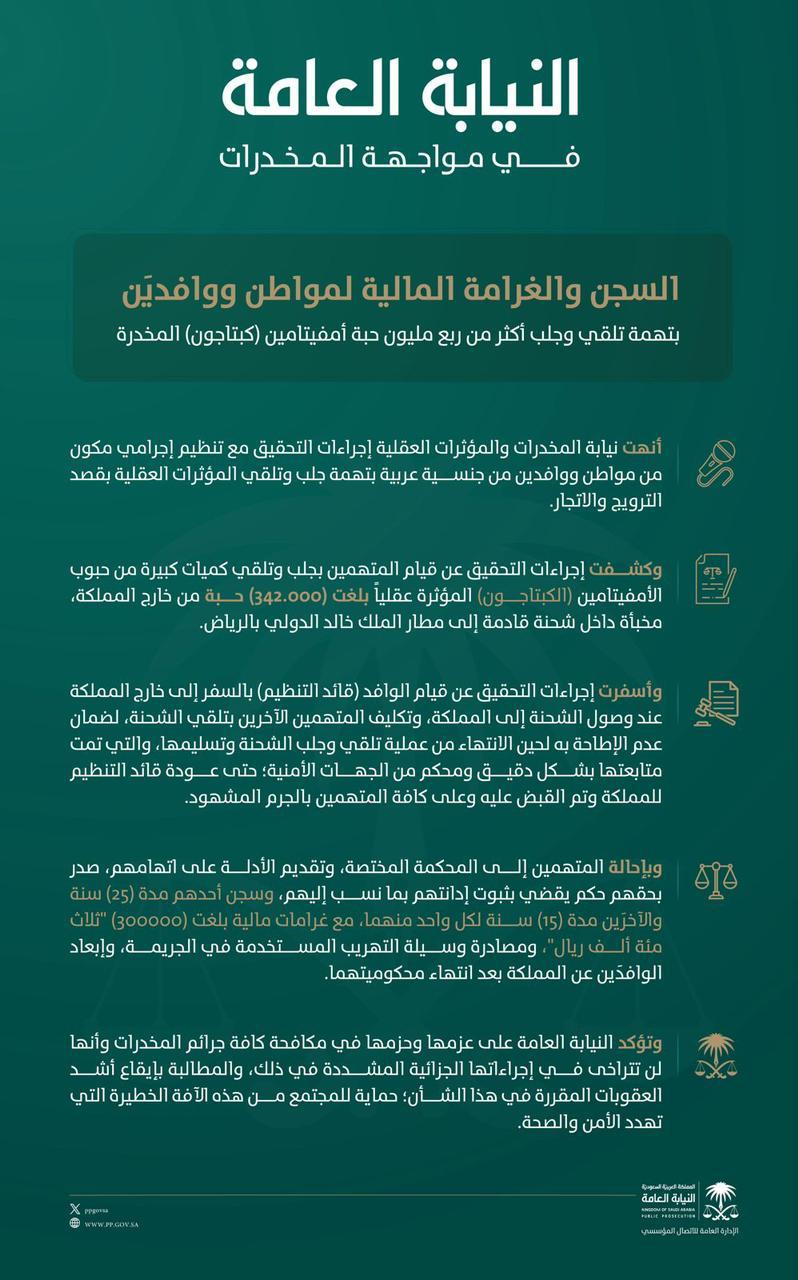 وبإحالة المتهمين إلى المحكمة المختصة، وتقديم الأدلة على اتهامهم، صدر بحقهم حكم يقضي بثبوت إدانتهم بما نسب إليهم، وسجن أحدهم مدة (25) سنة والآخرَين مدة (15) سنة لكل واحد منهما، مع غرامات مالية بلغت (300000) “ثلاث مئة ألف ريال”، ومصادرة وسيلة التهريب المستخدمة في الجريمة، وإبعاد الوافدَين عن المملكة بعد انتهاء محكوميتهما.
