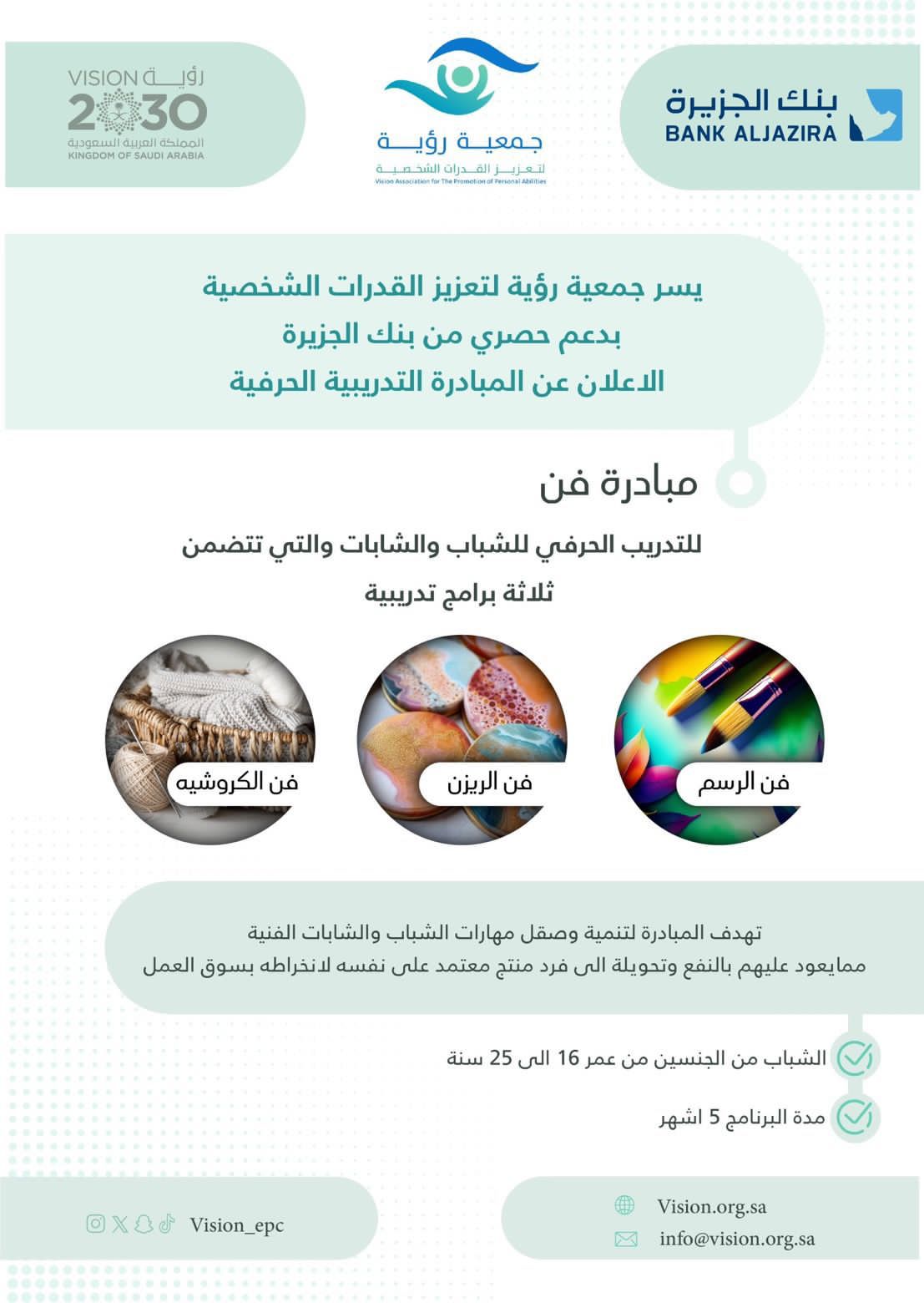 أعلنت جمعية رؤية لتعزيز القدرات الشخصية عن المبادرات التدريبية الحرفية مبادرة ( فن ) للتدريب الحرفي للشباب والشابات من سن 15 إلى 25 سنة ؛ وهي عبارة عن ثلاث برامج تدريبية تتمثل فيما يلي : فن الرسم – فن الريزن – فن الكروشية .