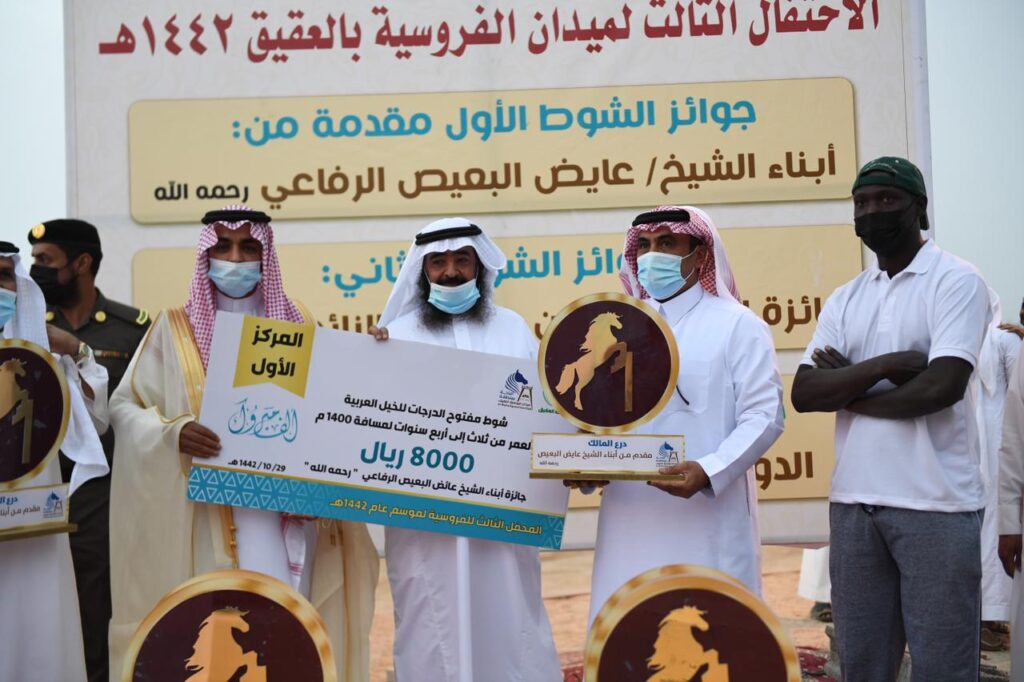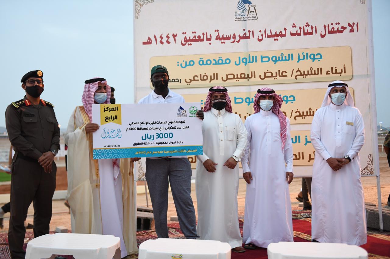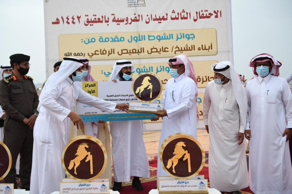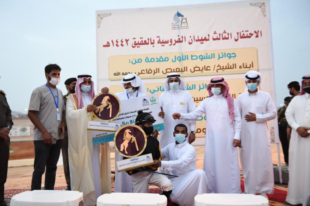وفي ختام السباق كرّم سعادة محافظ العقيق الأستاذ سالم بن طواله الفائزين في المحفل الثالث لسباقات الخيل للعام الحالي وقد التزم الجميع بما فرضته الجهات المشرفة على السباق بالإجراءات الوقائية والاحترازية، من فحص للحرارة، وتباعد جسدي، وترك مسافة آمنة، ولبس الكمام الإلزامي، واستخدام معقمات اليدين، ومرافقة سايس واحد لكل جواد.