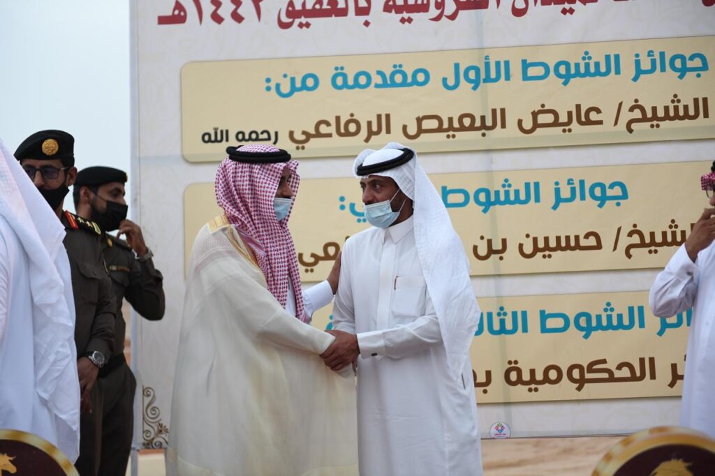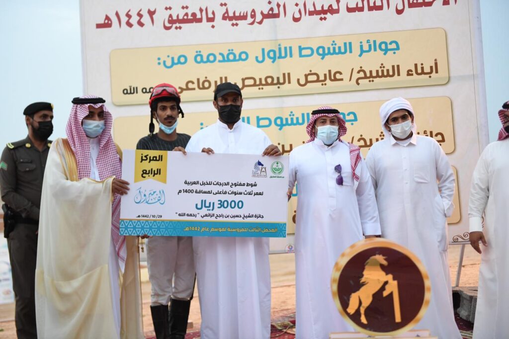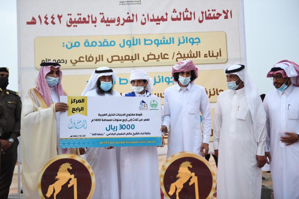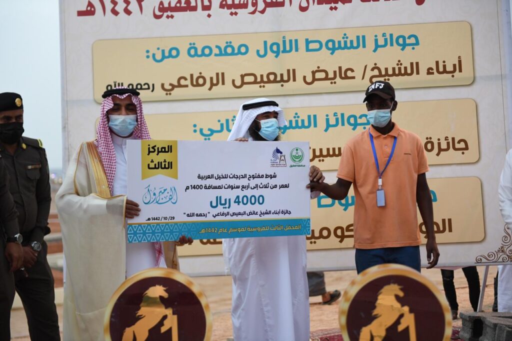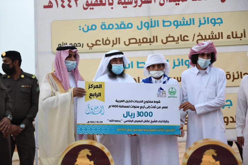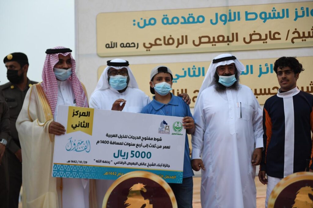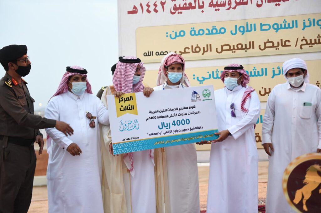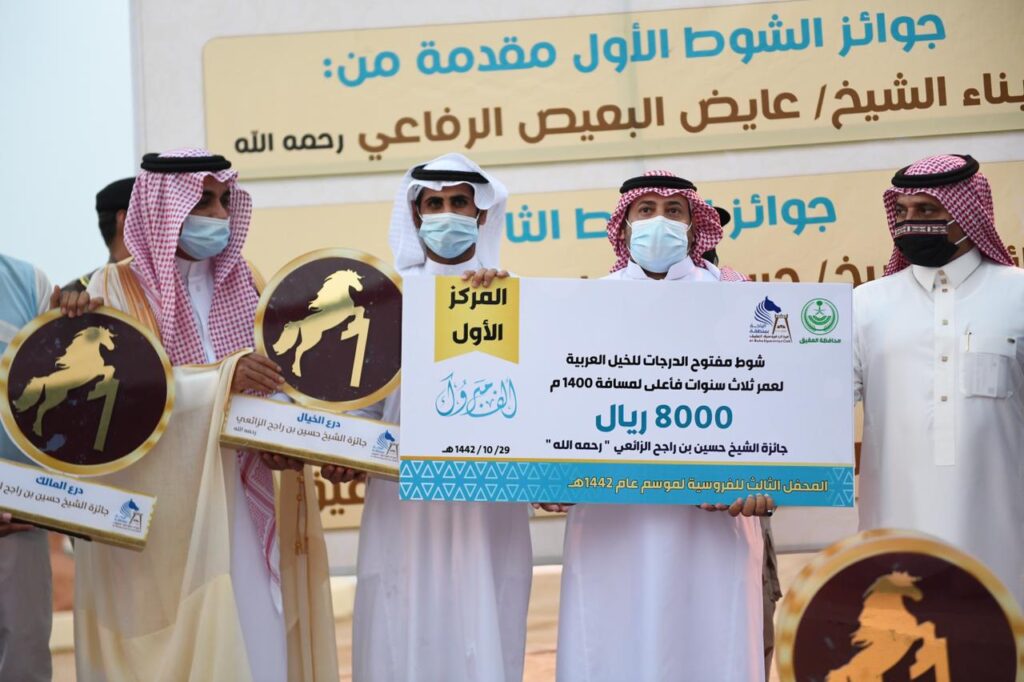 وجاءت نتائج أشواطه الثلاثة التي بلغت قيمت جوائزها ستون ألف ريال، بتحقيق المركز الأول للجواد مبارز الخالدية لمالكه إسطبل بندر آل حثلين بقيادة الخيال مهدي الحبيل على جائزة أبناء الشيخ عائض البعيص الرفاعي “رحمه الله” للخيل العربية مفتوح الدرجات بعمر من 3 إلى 4 سنوات لمسافة 1400 متراً وأتى في المركز الثاني الجواد آر مجزل لمالكه إسطبل صفوة الخيل بقيادة الخيال راكان العبيد ، فيما حصل الجواد منفرد لمالكه إسطبل حسن الغامدي بقيادة الخيال زياد الطربسي المركز الثالث، وجاء في المركز الرابع الجواد وبارود المغيرات لمالكه إسطبل مبارك حسين بقيادة الخيال جهاد الخلف، فيما كان الشوط الثاني على جائزة الشيخ حسين بن راجح الزائعي “رحمه الله” للخيل العربية مفتوح الدرجات بعمر 3 سنوات فأعلى لمسافة 1400 متراً ، حيث أتى الشوط من نصيب الجواد إبن الوطن لمالكه إسطبل فال العز وقيادة الخيال محمد الجريسي، وحصل على المركز الثاني الجواد عشق البراق، لمالكه إسطبل ذيب القنطاش، وقيادة الخيال عبدالله الهويريني، فيما حقق الجواد طالب الخالدية، لمالكه إسطبل فهد الشمري، وقيادة الخيال سيف الغضيان المركز الثالث، وأتى في المركز الرابع الجواد رصاص البارود، لمالكه إسطبل عبدالله الشهراني، وقيادة الخيال متعب الغامدي.