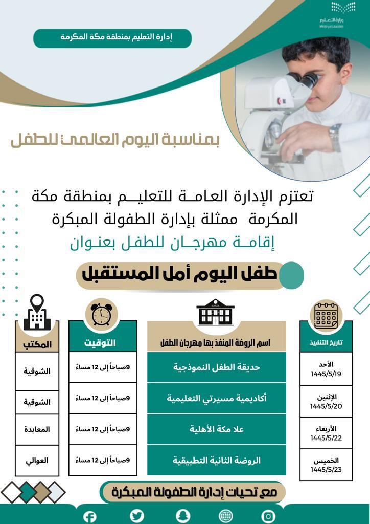 واصلت الإدارة العامة للتعليم بمنطقة مكة المكرمة ممثلة في إدارة الطفولة المبكرة تنفيذ فعاليات اليوم العالمي للطفل 2023 تحت شعار (طفل اليوم أمل المستقبل) من يوم الأحد وحتى يوم الخميس 19-23/ 5/1445هـ في كلٍ من: روضة حديقة الطفل النموذجية ،