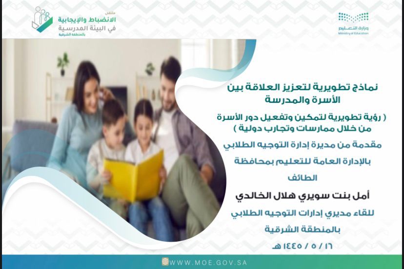 شارك تعليم الطائف ممثلًا في التوجيه الطلابي (بنات) ،في ملتقى قيادات التوحيه الطلابي والذي جاء تحت عنوان” الانضباط والإيجابية في البيئة المدرسية “، والذي اقيم في المنطقة الشرقية، بمشاركة ادارات التعليم في مناطق المملكة بهدف تفعيل دور الأسرة في الشراكة مع المدرسة، لكون الأسرة الحاضنة الأولى للأبناء والمسؤلية عن غرس القيم وتأصيل الاتجاهات، وتعليم السلوكيات السليمة . قدمت مديرة التوجيه الطلابي ورقة عمل “رؤية تطويرية لتمكن وتفعيل دور الأسرة من خلال ممارسات وتجارب دولية، بهدف البحث عن التحديات الكامنة في إشراك مجموعة من أولياء الأمور ذوي الخلفيات الإقتصادية والإجتماعية المختلفة في مراحل التعليم العام