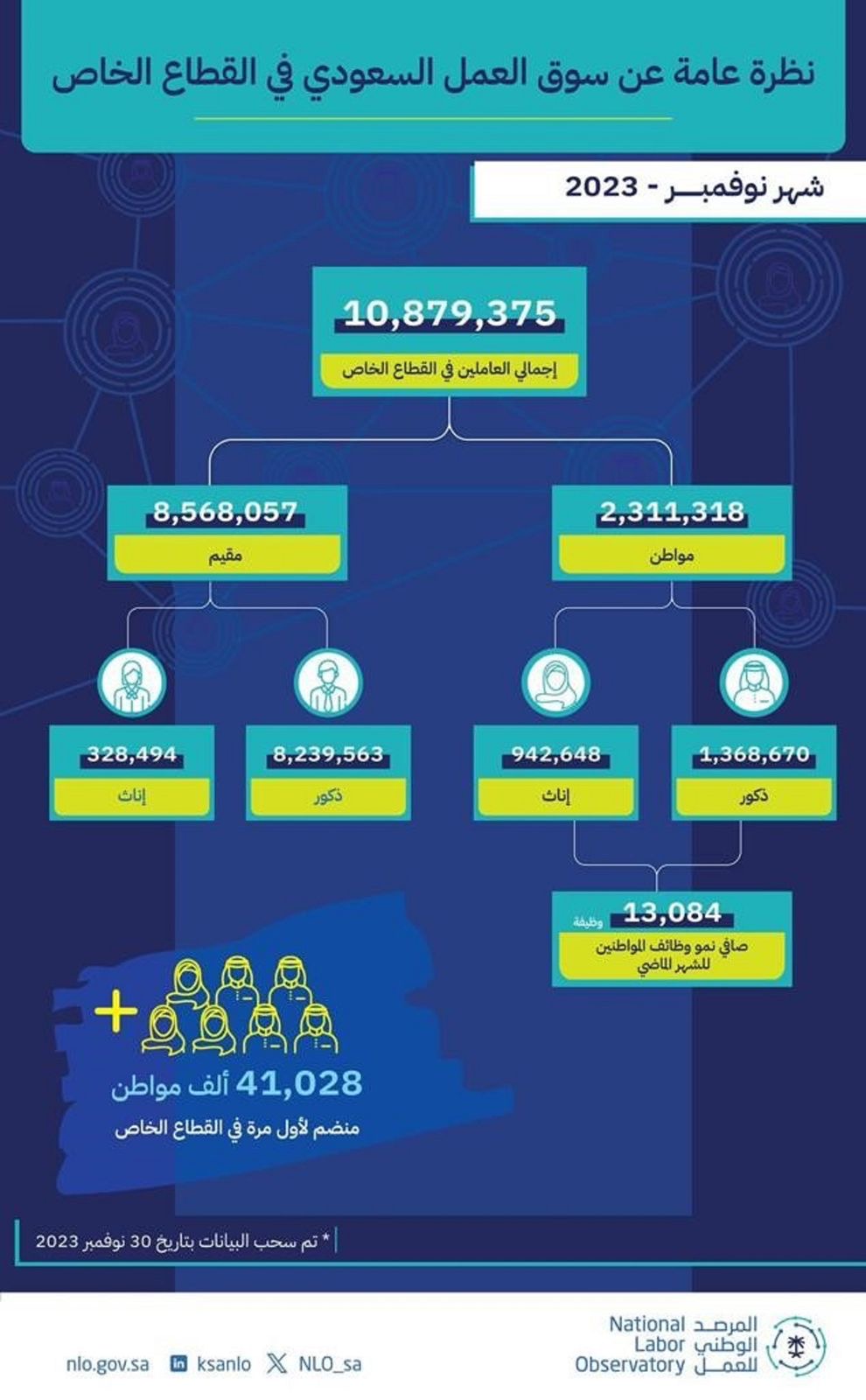 ويستعرض التقرير صافي نمو وظائف المواطنين لشهر نوفمبر والذي بلغ (13,084) وظيفة، كما انضم (41,028) ألف مواطن لأول مرة في القطاع الخاص.