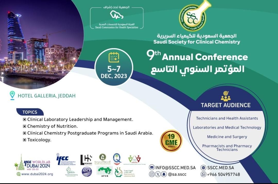 انطلق المؤتمر الدولي الخامس للكيمياء السريرية في مدينة جدة و المعتمد بعدد ” ١٩ ساعة تعليم طبي ” و بتنظيم الجمعية السعودية للكيمياء السريرية المؤتمر الدولي الخامس و مؤتمرها السنوي التاسع بالفترة بين ” ٥ ” و ” ٧ ” ديسمبر .