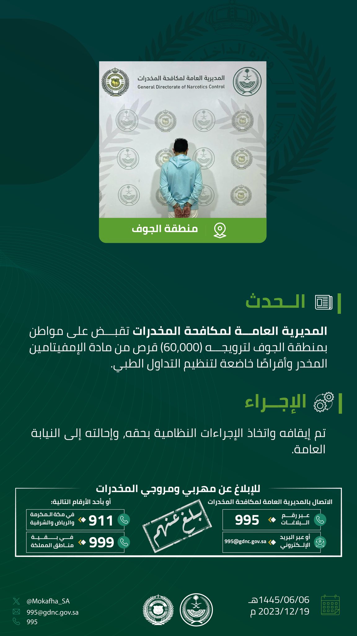 عبر موقع #مكافحة_المخدرات @Mokafha_SA منشور بانه تم القبض على مواطن بمنطقة الجوف لترويجه (60,000) قرص من مادة الإمفيتامين المخدر وأقراصًا خاضعة لتنظيم التداول الطبي