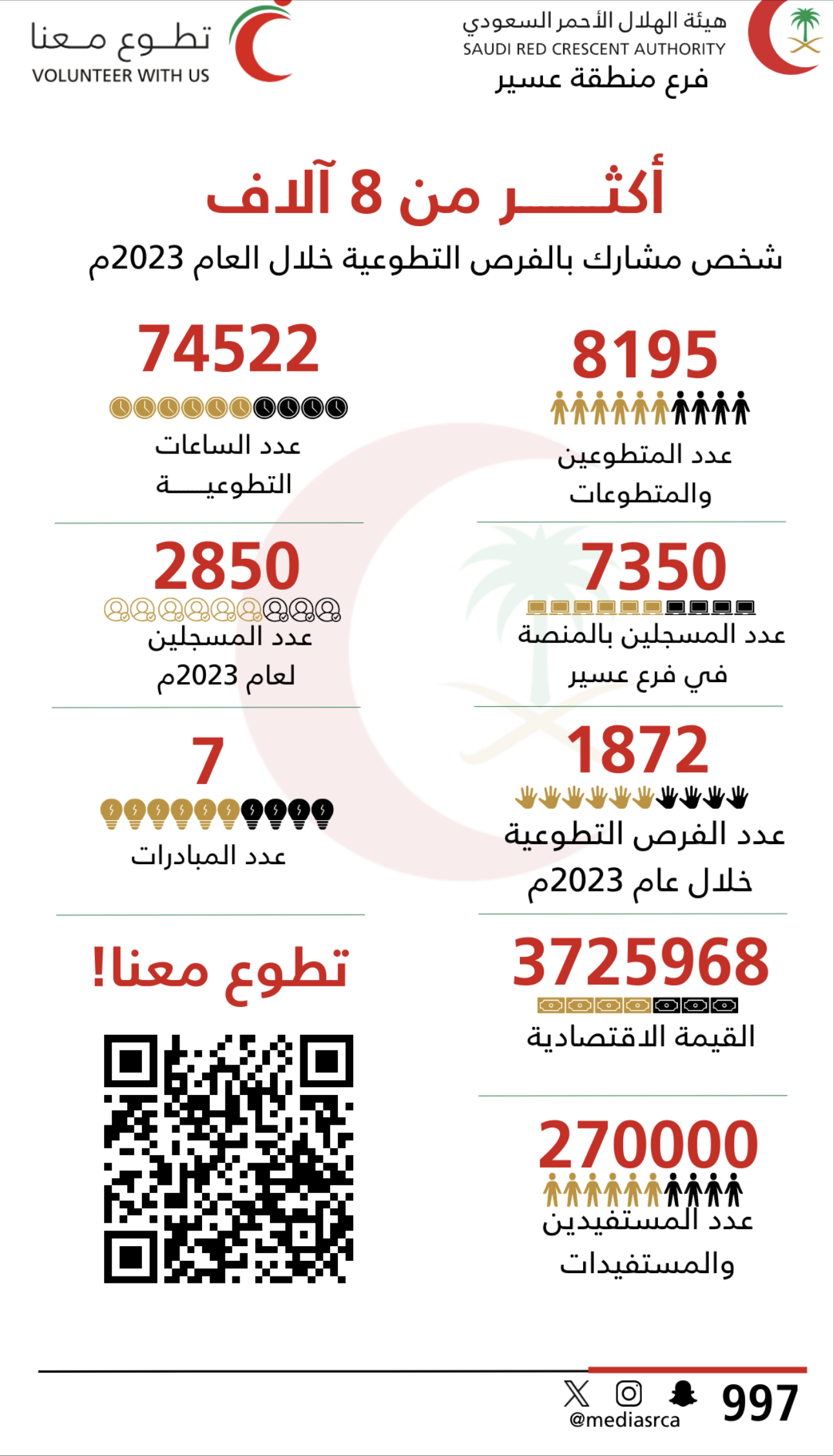 وبين مدير عام فرع هيئة الهلال الأحمر بمنطقة عسير الأستاذ محمد بن عبدالله الشهري أن ادارة التطوع بفرع الهيئة بمنطقة عسير ، نفذت ١٨٧٢* فرصة تطوعية ياتي في مقدمتها تقديم الخدمات الإسعافية والطبية بمشاركة ٨١٩٥متطوعاً ومتطوعة، أكملوا فيها ٧٤,٥٢٢ساعة تطوعية ميدانية، شملت العديد من المهام والأعمال في مجال التخصصات الصحية وغيرها من الخدمات الاجتماعية والإنسانية.