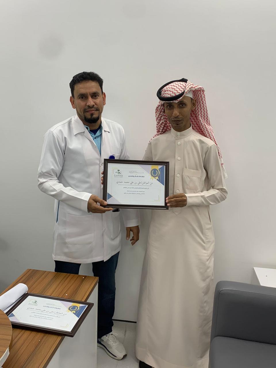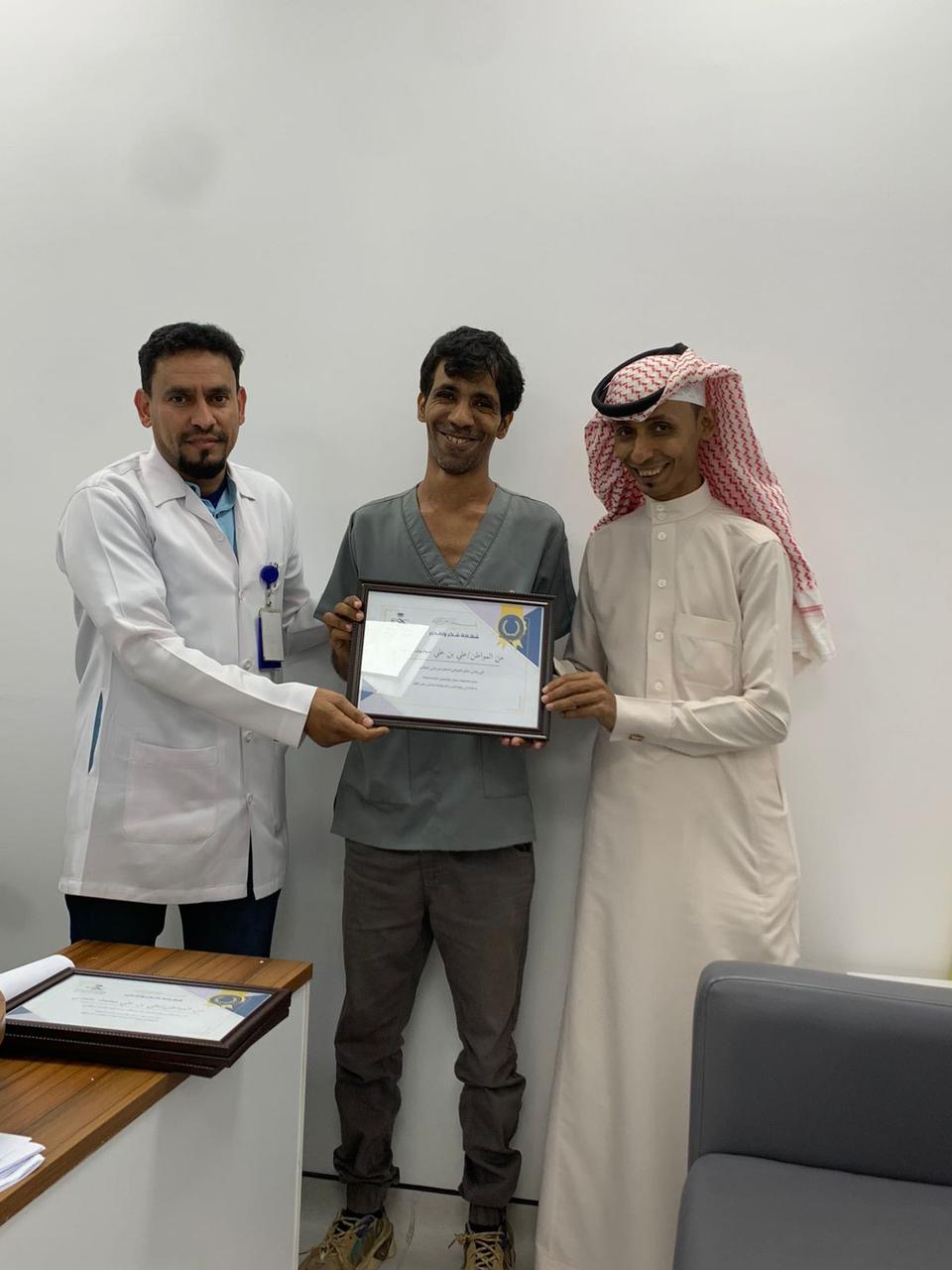 الجدير بالذكر أن المكرمون هم : أخصائي علاج طبيعي / عبدالله بن محمد محمد خبراني، وفني علاج طبيعي / سلمان بن حسن محمد مباركي، وأخصائي علاج طبيعي / سامي بن عبدالله بجوي، وفني علاج طبيعي / حسن بن علي قيسي، وكانت فتره العلاج بمتابعة وإشراف رئيس قسم العلاج الطبيعي أ/ راشد بن يحي هلمان.