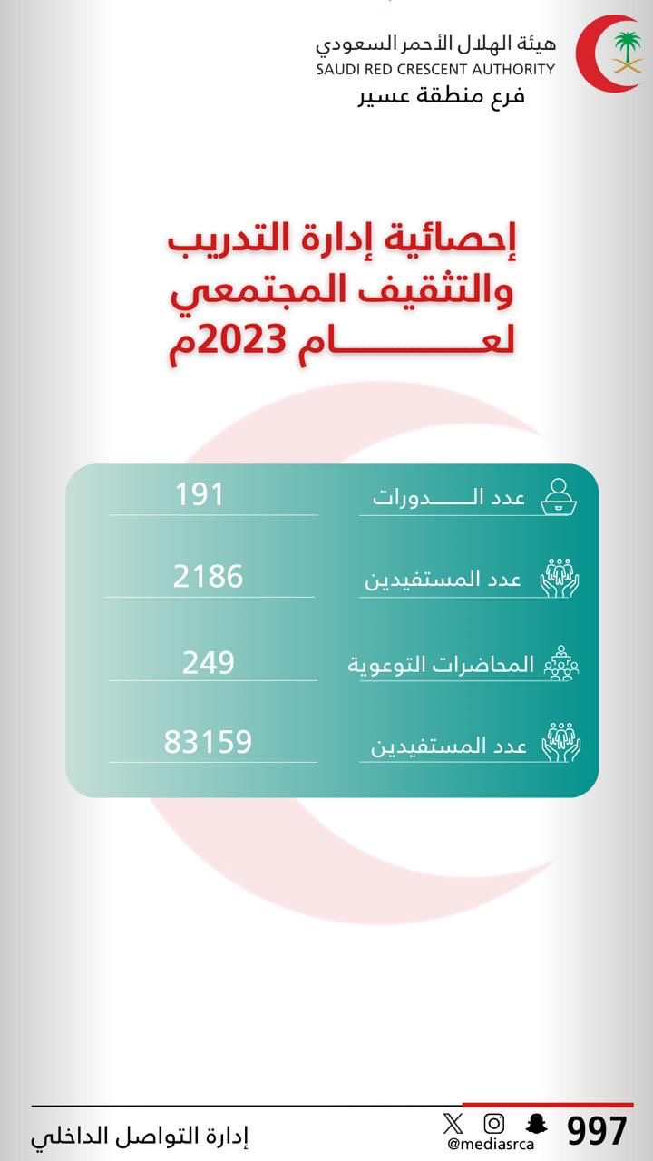 نفذت إدارة التدريب والتثقيف المجتمعي بهيئة الهلال الأحمر السعودي بمنطقة عسير خلال العام المنصرم ٢٠٢٣(191) دورة تدريبية لبرنامج سفير الحياة ، وبرامج البروتوكولات العلاجية للمختصين في المجال الصحي، وبلغ مجموع المستفيدين (2186) مستفيد من الجنسين رجال ونساء.