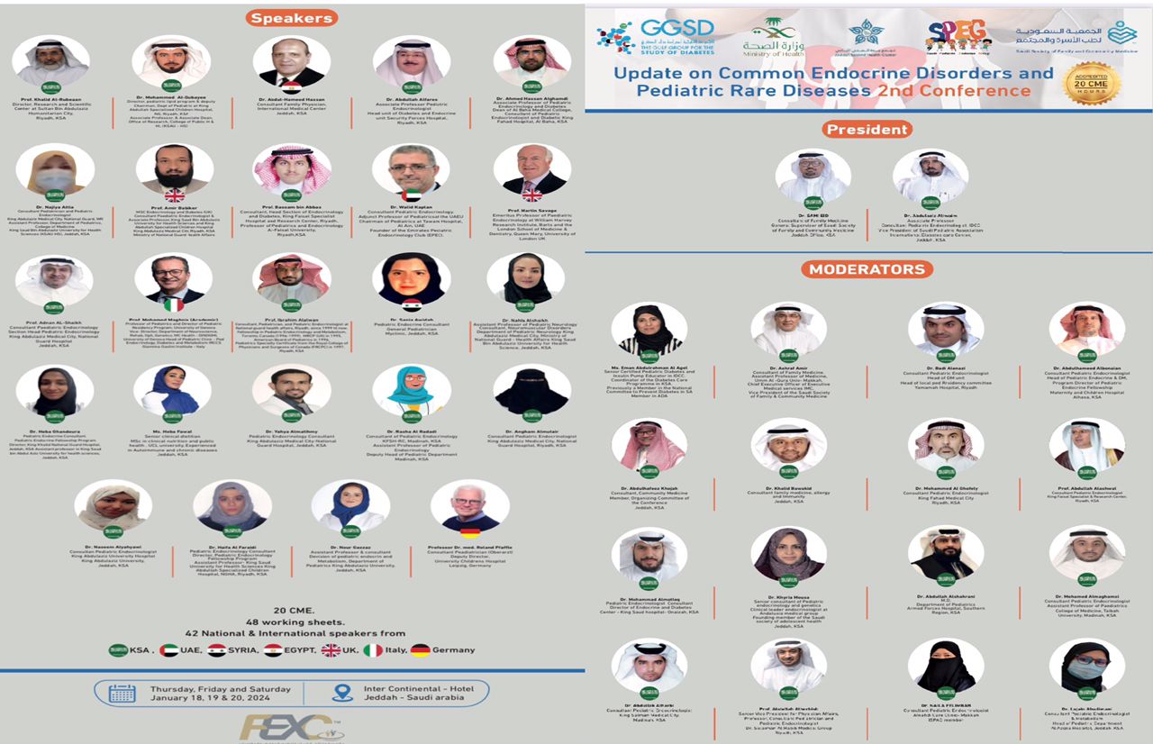 تنطلق يوم غد الخميس 18 يناير 2024م الأنشطة والفعاليات العلمية للمؤتمر الدولي الثاني الذي دعت إليه الجمعية السعودية لطب الأسرة والمجتمع – فرع جدة بالتعاون مع المجموعة السعودية لأطباء الغدد والمجموعة الخليجية لدراسة مرض السكري تحت عنوان “المستجدات في الاضطرابات الشائعة للغدد الصماء والأمراض النادرة في الأطفال.