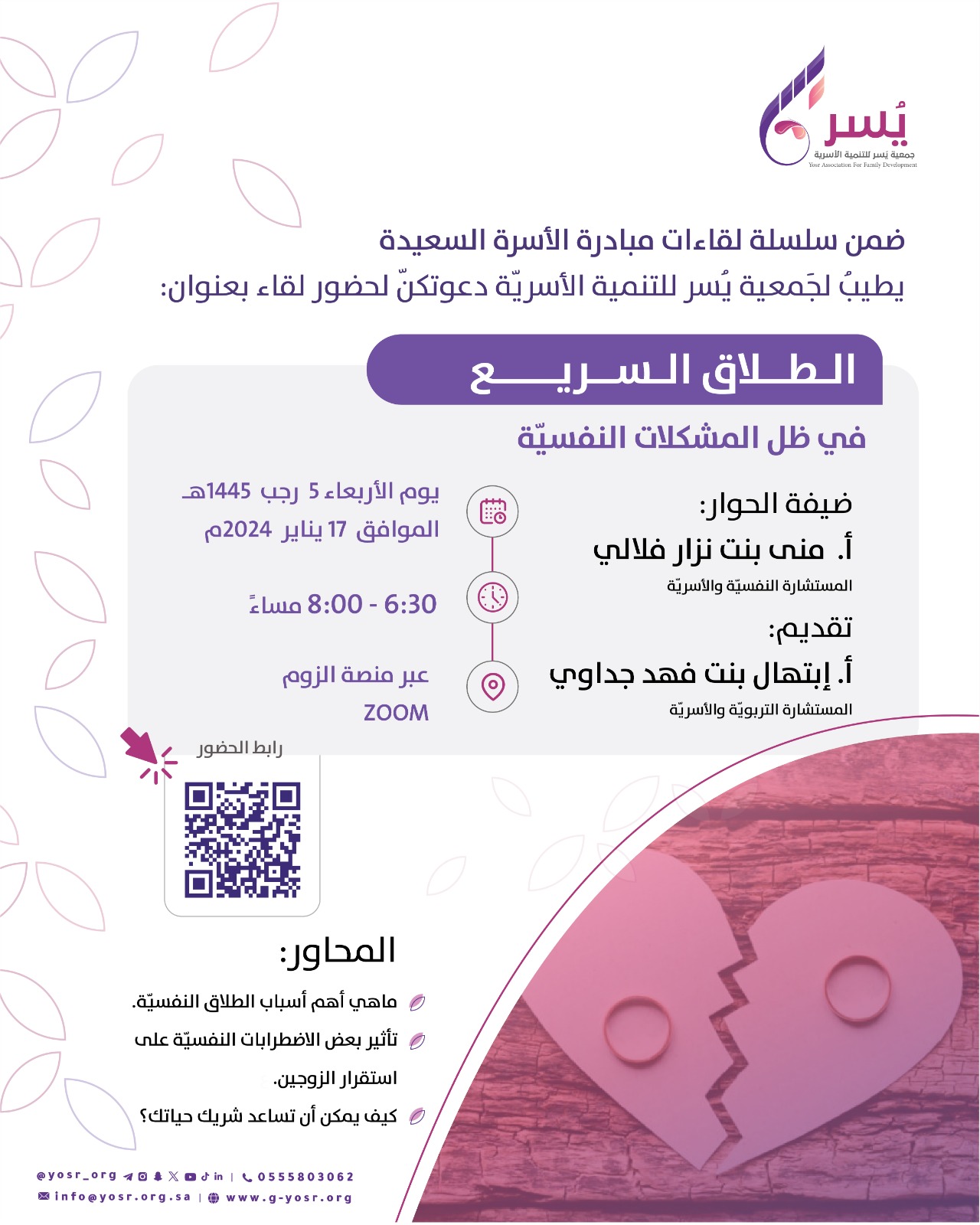 ضمن سلسلة لقاءات مبادرة الأسرة السعيدة التي تنظمها جمعيّة يُسر للتنميّة الأسريّة بمكة المكرمة تقيم الجمعيةلقاء بعنوان الطلاق السريع في ظل المشكلات النفسيّة