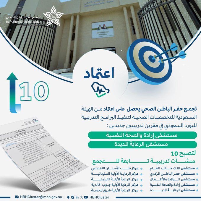 حصل تجمع حفر الباطن الصحي على اعتماد الهيئة السعودية للتخصصات الصحية لتنفيذ البرامج التدريبية للبورد السعودي بمقرين تدريبين إضافيين وهما ( مستشفى إرادة والصحة النفسية ، ومستشفى الرعاية المديدة ) لتصبح المقرات التدريبية المعتمدة لتجمع حفر الباطن الصحي لتنفيذ برامج البورد السعودي عشرة مقرات تدريبية.