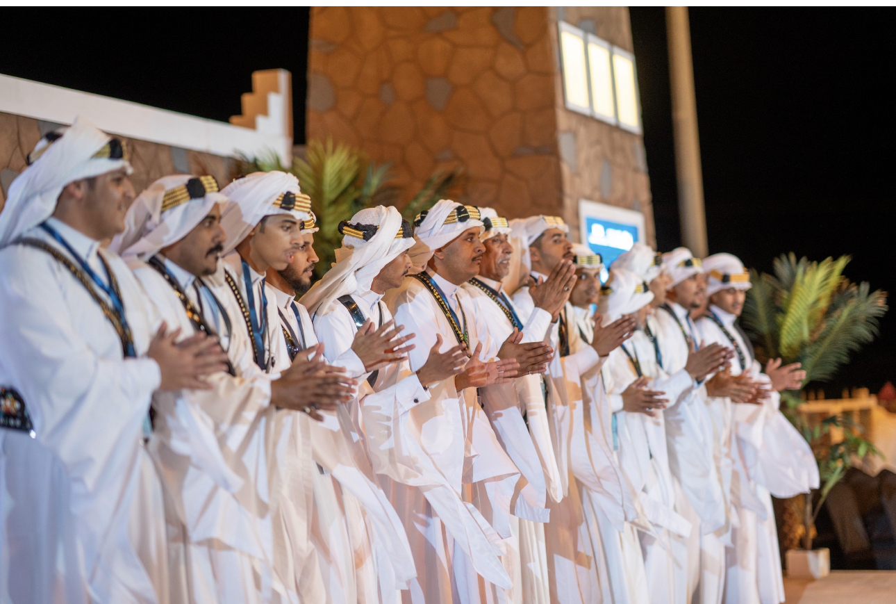 وبعدها قدّمت فرقة بني شهر من منطقة عسير “فن اللعب الشهري”، الذي يجمع بين الشعر والموسيقى والحركة الجماعية المتناسقة، بطريقةٍ فنية تعتمد على استخدام الطبل، وترديد اللحن المترافق مع حركة اليدين، ثم الإنحناء بحركة سريعة نحو الأرض ليقفوا مرة أخرى، مع تكرار هذا الأداء عدة مرات متتالية وبانسجامٍ لافت.