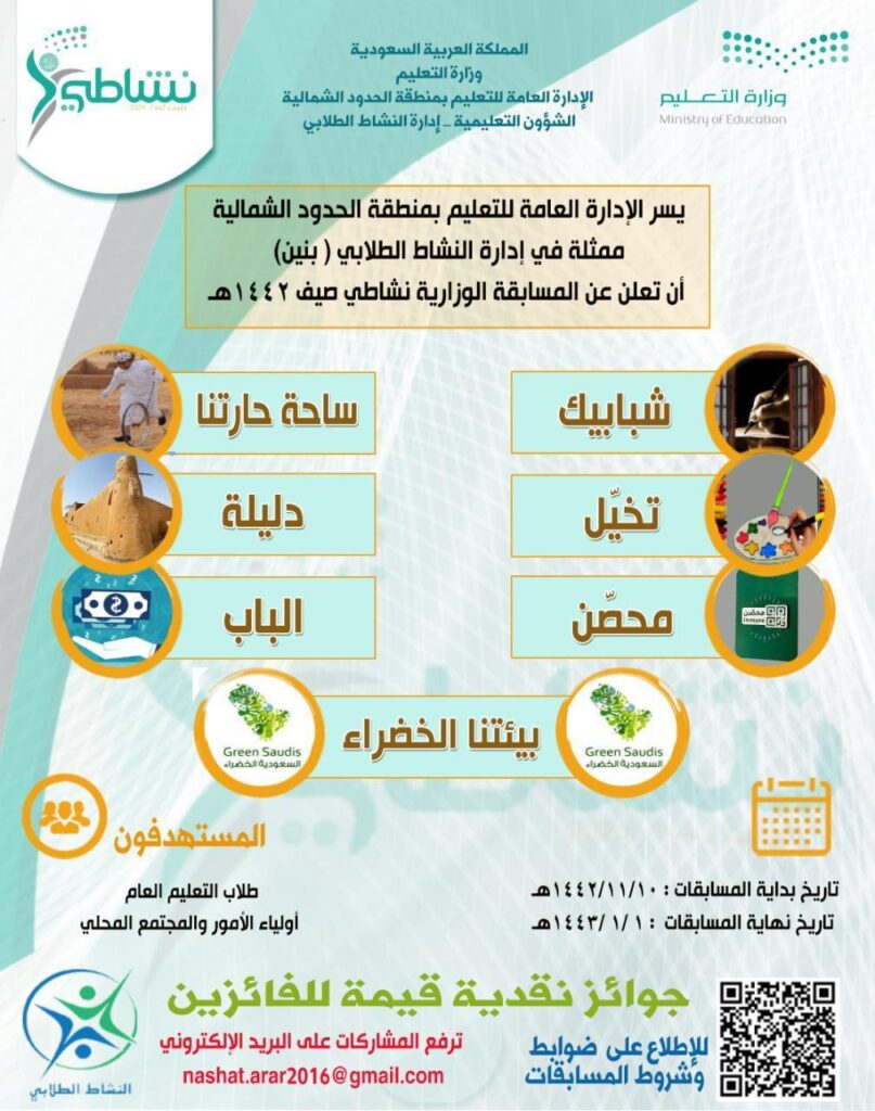 أعلنت الإدارة العامة للتعليم في منطقة الحدود الشمالية عن تنفيذ برنامج النشاط الصيفي نشاطي للعام ١٤٤٢هـ؛ لتعزيز القيم الوطنية والتربوية المتحققة في الأنشطة الطلابية لمختلف المراحل التعليمية، من خلال عدد من المسابقات والنشاطات والبرامج الصيفية وفق خطة زمنية.