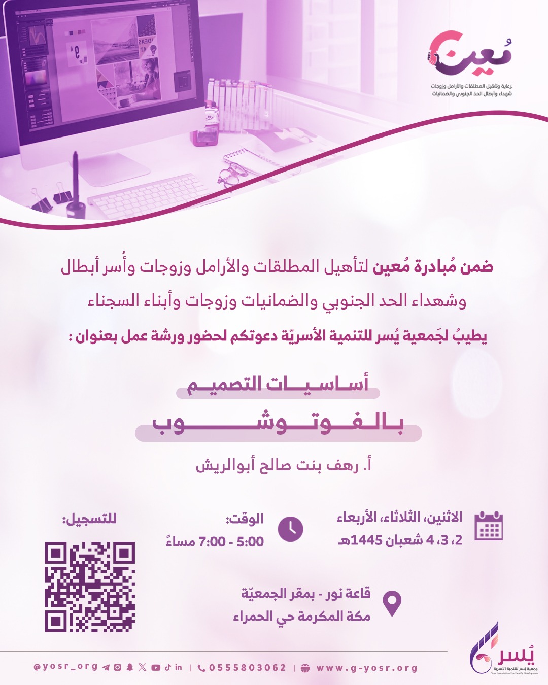 ضمن الأنشطة والبرامج والفعاليات والمبادرات التي تقوم بها جمعية يسر للتنمية الأسرية بمكة المكرمة وضمن مُبادرة مُعين لتأهيل المطلقات والأرامل وزوجات وأُسر أبطال وشهداء الحد الجنوبي والضمانيات وزوجات وأبناء السجناء.
