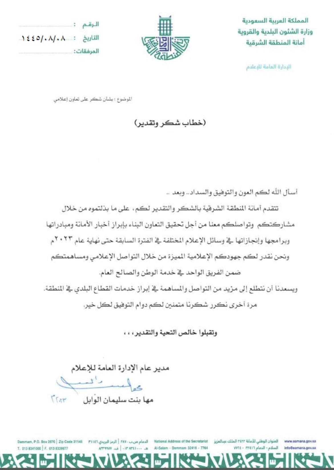 خطاب شكر لصحيفة أحوال الإلكترونية ممثلاً في العلاقات العامة والتواصل المؤسسي الأستاذة/ “طليعه الحفظي“وذلك للجهود الإعلامية من خلال التواصل الإعلامي والمساهمة ضمن الفريق الواحد في خدمة الوطن والصالح العام والمساهمة في إبراز خدمات القطاع البلدي في المنطقةالشرقية. وصحيفة أحوال بدورها تثني بالشكر والعرفان لهذه البادرة الكريمة من قِبَلْ “أمانة المنطقة الشرقية“وتثمينهم الجهود الصحفيَّة والتعاون المشترك في كل مايصب في خدمة الوطن والمواطن والمقيم .