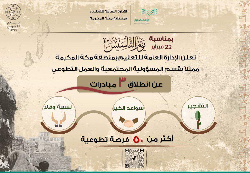 أطلقت الإدارة العامة للتعليم بمنطقة مكة المكرمة ممثلة بقسم المسؤولية المجتمعية والعمل التطوعي 3 مبادرات تطوعية : التشجير، سواعد الخير، لمسة وفاء و أكثر من 50 فرصة تطوعية وذلك بزيارة دار الرعاية الاجتماعية بمكة المكرمة للاحتفاء بذكرى تأسيس الدولة السعودية.