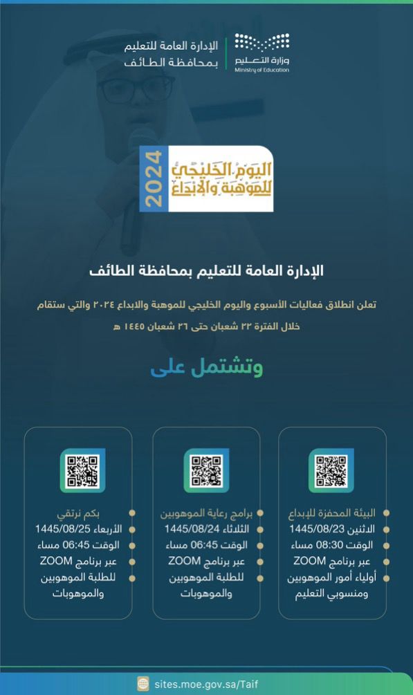 نفذت الادارة العامة للتعليم بمحافظة الطائف ممثلة في إدارة تنمية القدرات قسم الموهوبين، الأسبوع الوطني واليوم الخليجي للموهبة والإبداع 1445هـ وذلك في جميع المدارس ، خلال الفترة من 22 – 26 / 8 / 1445هـ .
