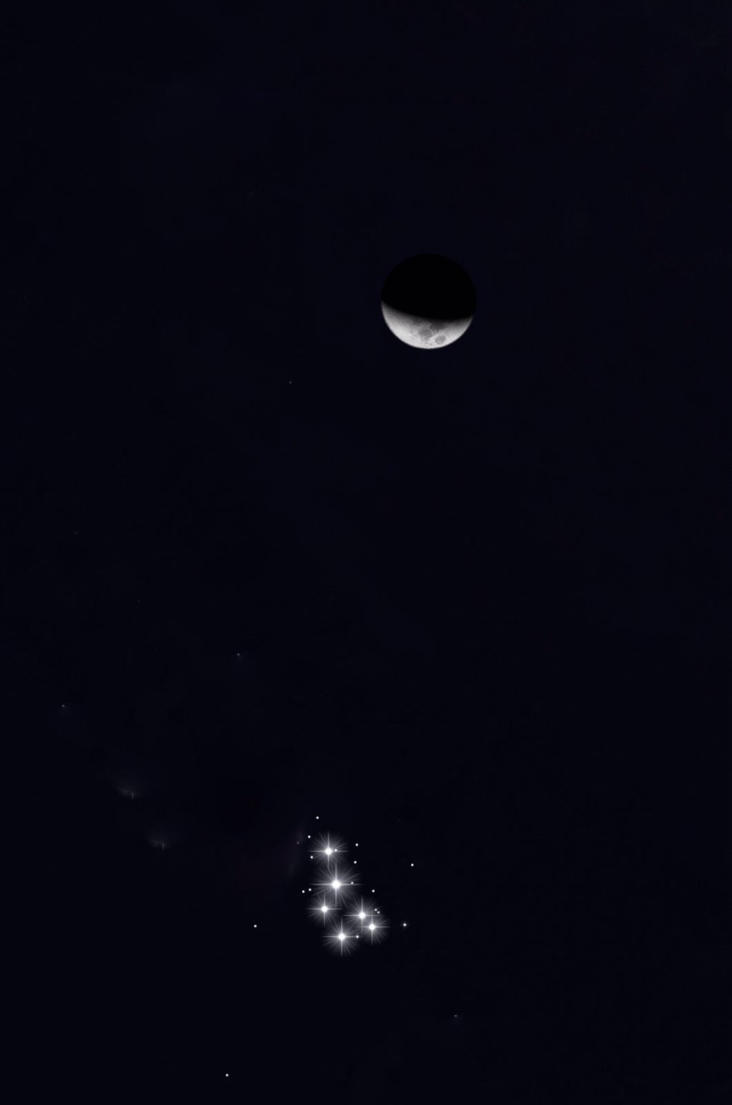فبعد غروب الشمس سيشاهد القمر عالياً في السماء لكن عنقود الثريا لا يمكن رؤيته من داخل المدن بسبب التلوث الضوئي وكذلك وجود ضوء القمر لذلك هناك حاجة لاستخدام المنظار بعد حلول ظلمة الليل حيث سيظهر القمر وعنقود الثريا في نفس مجال الرؤية في منظر جميل وهذه فرصة كذلك للتصوير الفلكي.
