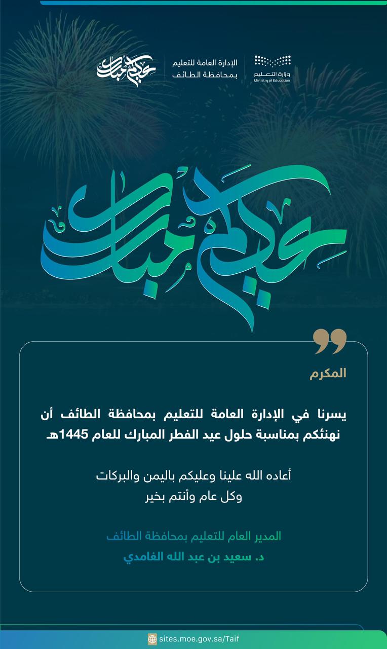 وتزامناً مع عيد الفطر المبارك لعام 1445 بعثت الادارة العامة للتعليم بالطائف أكثر من 1000 رسالة تهنئة بالعيد السعيد للجهات الحكومية والقطاع الخاص والقطاع الغير ربحي بالمحافظة تحمل في طياتها تبادل التهاني بعيد الفطر المبارك