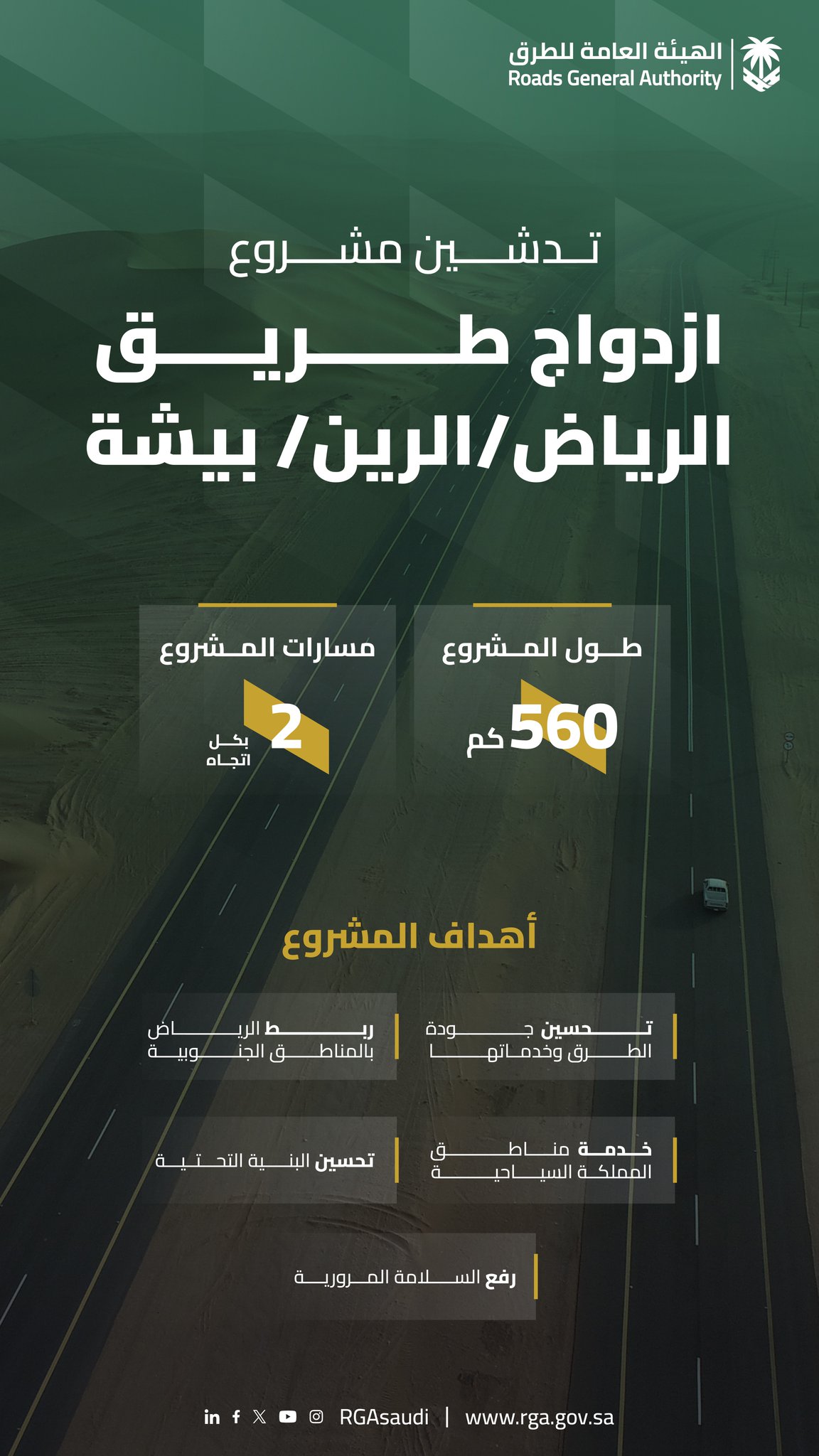 يعد مشروع ازدواج طريق الرياض الرين بيشة الذي دشنه سمو أمير منطقة الرياض ضمن 30 مشروعًا للطرق بالمنطقة تتبع للهيئة العامة للطرق، ويبلغ طوله 560 كم، والمكون من مسارين بكل اتجاه، من أهم المشاريع بالمنطقة لدوره الحيوي في رفع مستوى السلامة والارتقاء بتجربة المستخدمين وتعزيز جودة الحياة.
