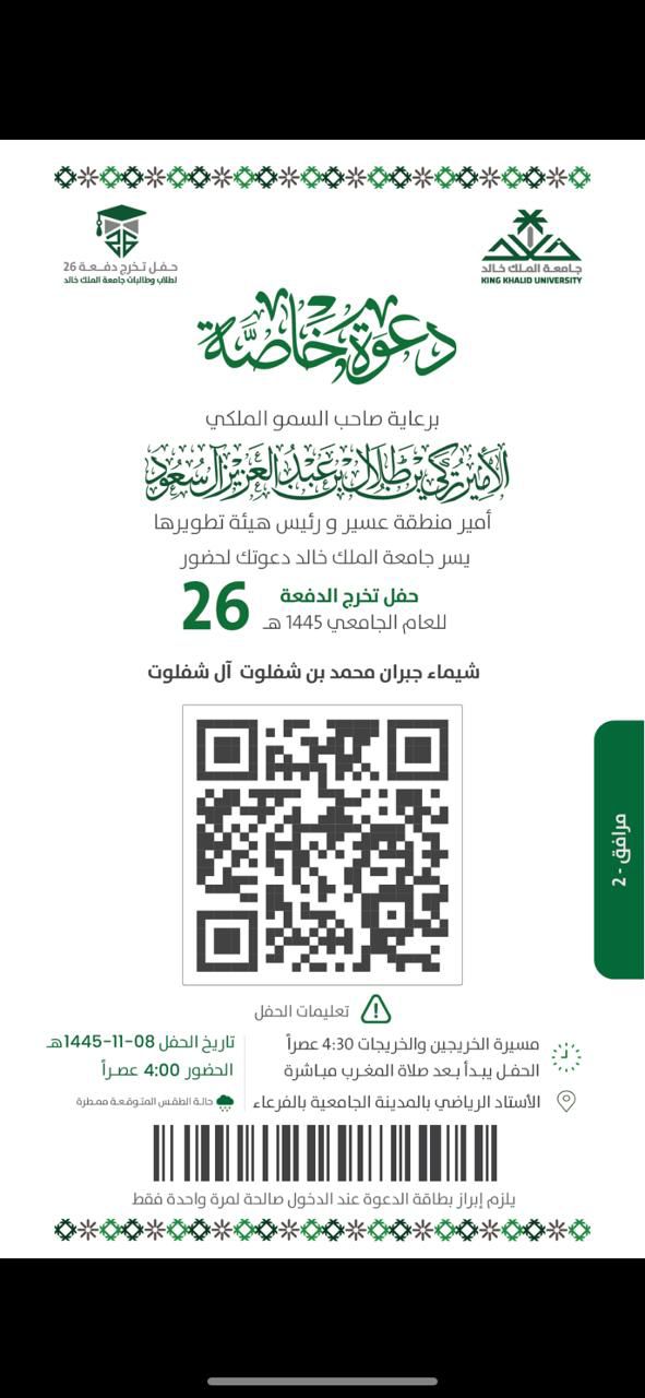 (بتقدير ممتاز مع مرتبة الشرف ) تهنئة خاصة من صحيفة أحوال للأستاذ جبران وأسرة آل شفلوت بمحافظة خميس مشيط وندعو الله تعالى له وبالتوفيق والسداد والنجاح والتميز.