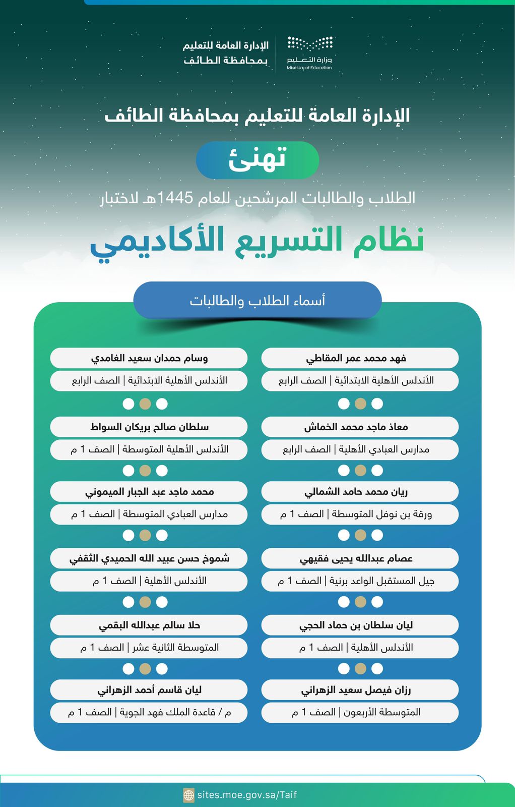 صدرت موافقة وزارة التعليم على ترشح عدد 12 طالب وطالبة موهوب لدخول اختبار نظام التسريع الأكاديمي لعام 1445هـ في الادارة العامة للتعليم في محافظة الطائف لاجتيازهم الشروط والضوابط المؤهلة لدخول الاختبار ،