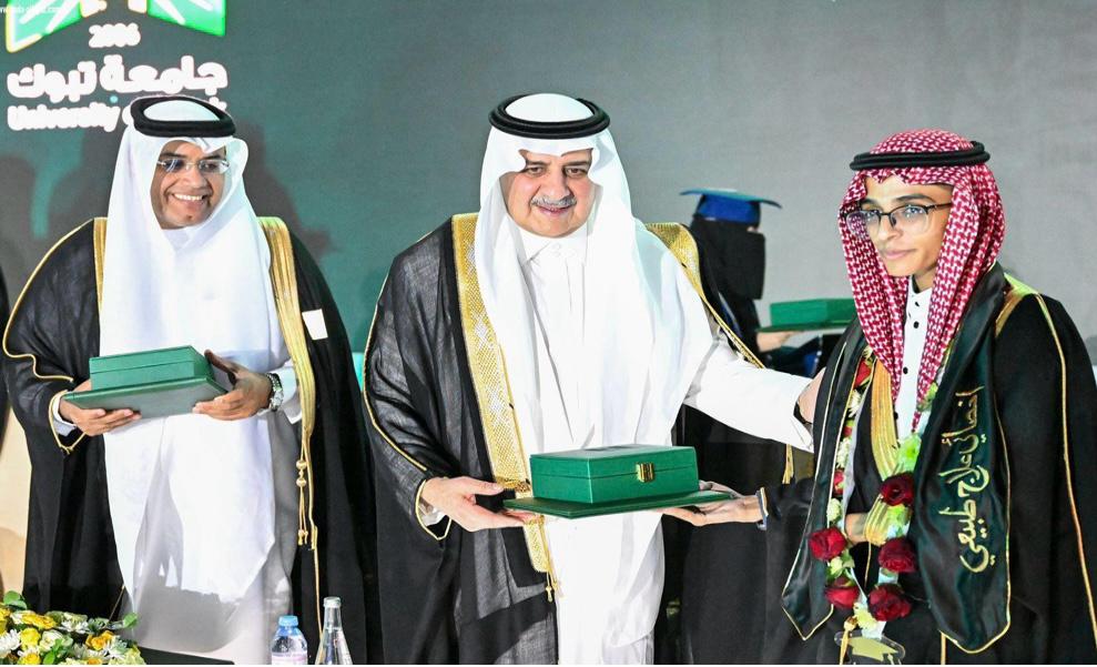 ثم قام سمو أمير منطقة تبوك بتسليم شهادات التخرج لأوائل الخريجين والخريجات، مباركًا لهم ولأولياء أمورهم ومعلميهم وجامعاتهم.
