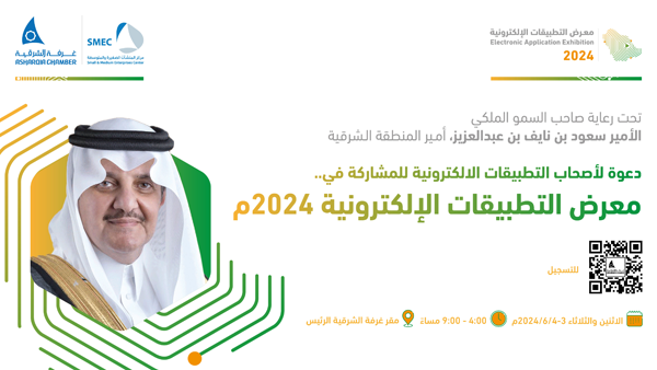 يرعى صاحب السمو الملكي الأمير سعود بن نايف بن عبدالعزيز، أمير المنطقة الشرقية، يوم غدٍ الإثنين ال3 من شهر يونيو النسخة الثانيةمن معرض التطبيقات الإلكترونية 2024