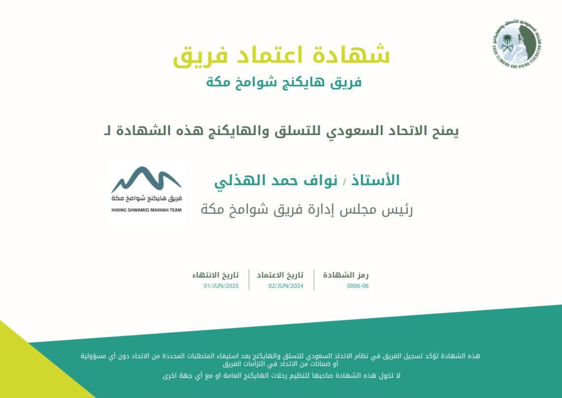ثقه في محلها من قبل الاتحاد السعودي للتسلق والهايكنج لهذا الفريق العظيم هايكنج شوامخ مكه