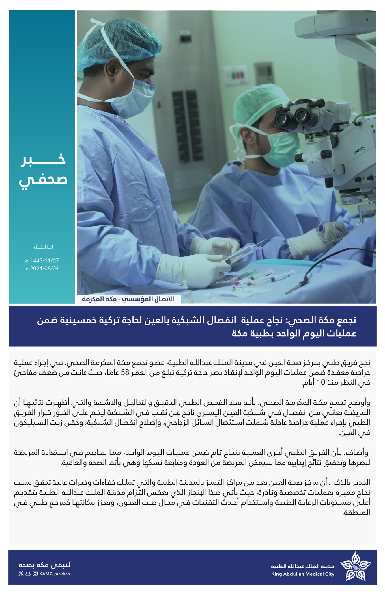 يذكر أن مركز صحة العين يعد من مراكز التميز بالمدينة الطبية والتي تملك كفاءات وخبرات عالية تحقق نسب نجاح مميزه بعمليات تخصصية ونادرة، حيث يأتي هذا الإنجاز الذي يعكس التزام مدينة الملك عبدالله الطبية بتقديم أعلى مستويات الرعاية الطبية واستخدام أحدث التقنيات في مجال طب العيون، ويعزز مكانتها كمرجع طبي في المنطقة.